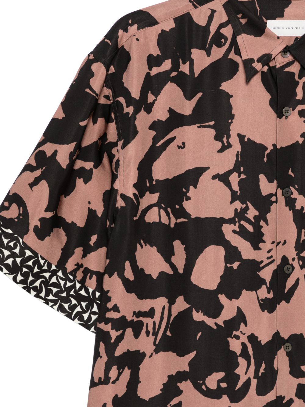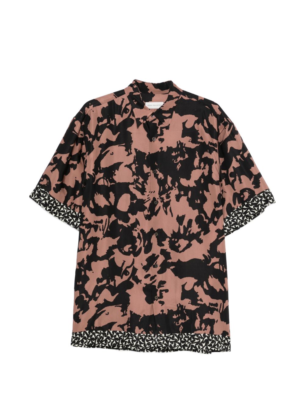 Camicia rosa di Dries Van Noten in viscosa con colletto classico, manica corta, chiusura frontale con bottoni e orlo dritto.