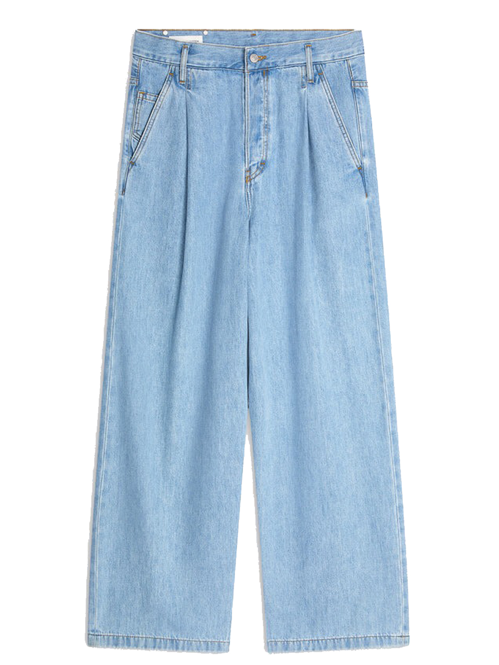 Jeans blu di Dries Van Noten in cotone con vita cpn passanti, chiusura frontale con bottone e zip, pieghe, design 5 tasche, vestibilità ampia e orlo dritto.