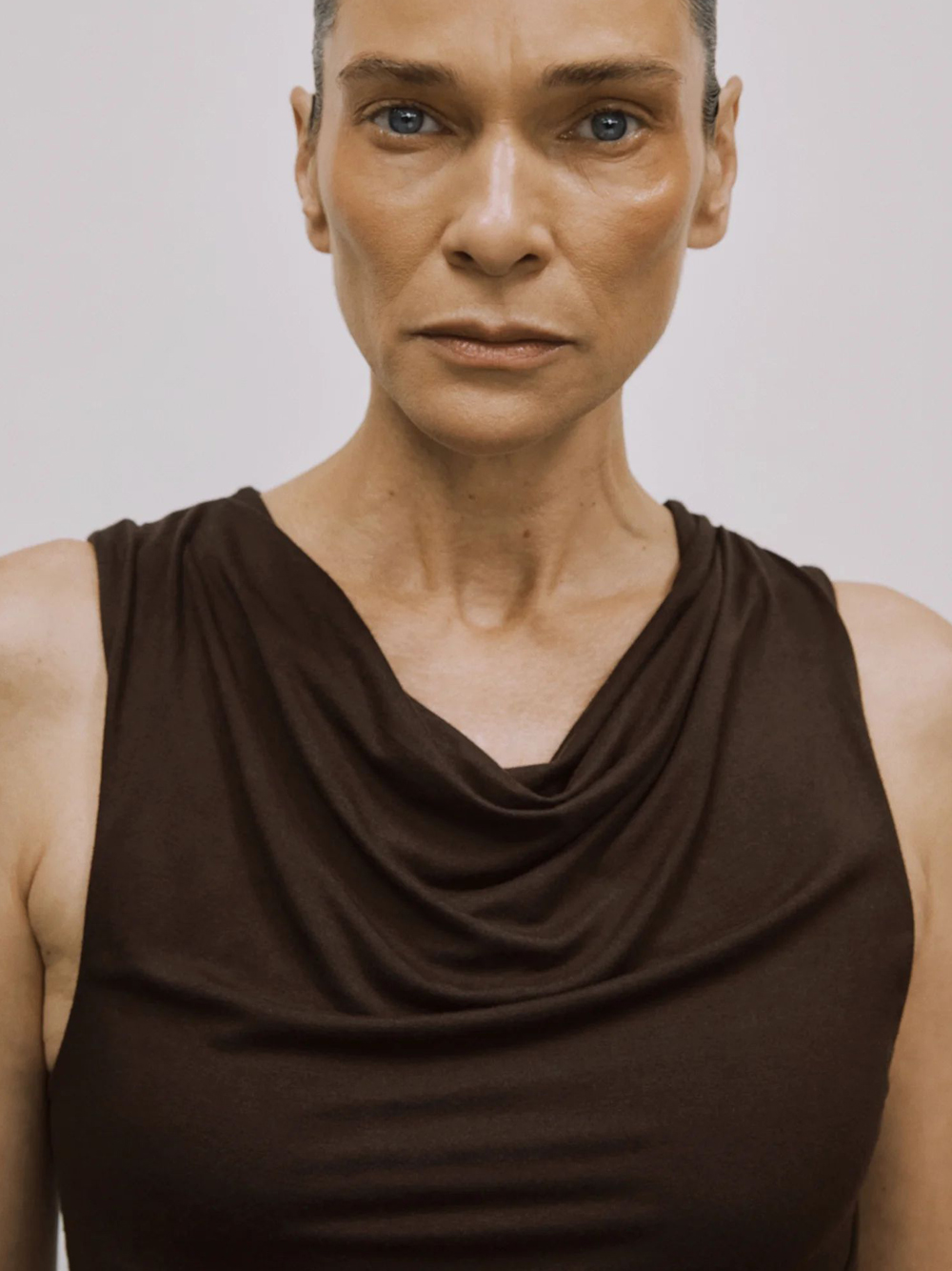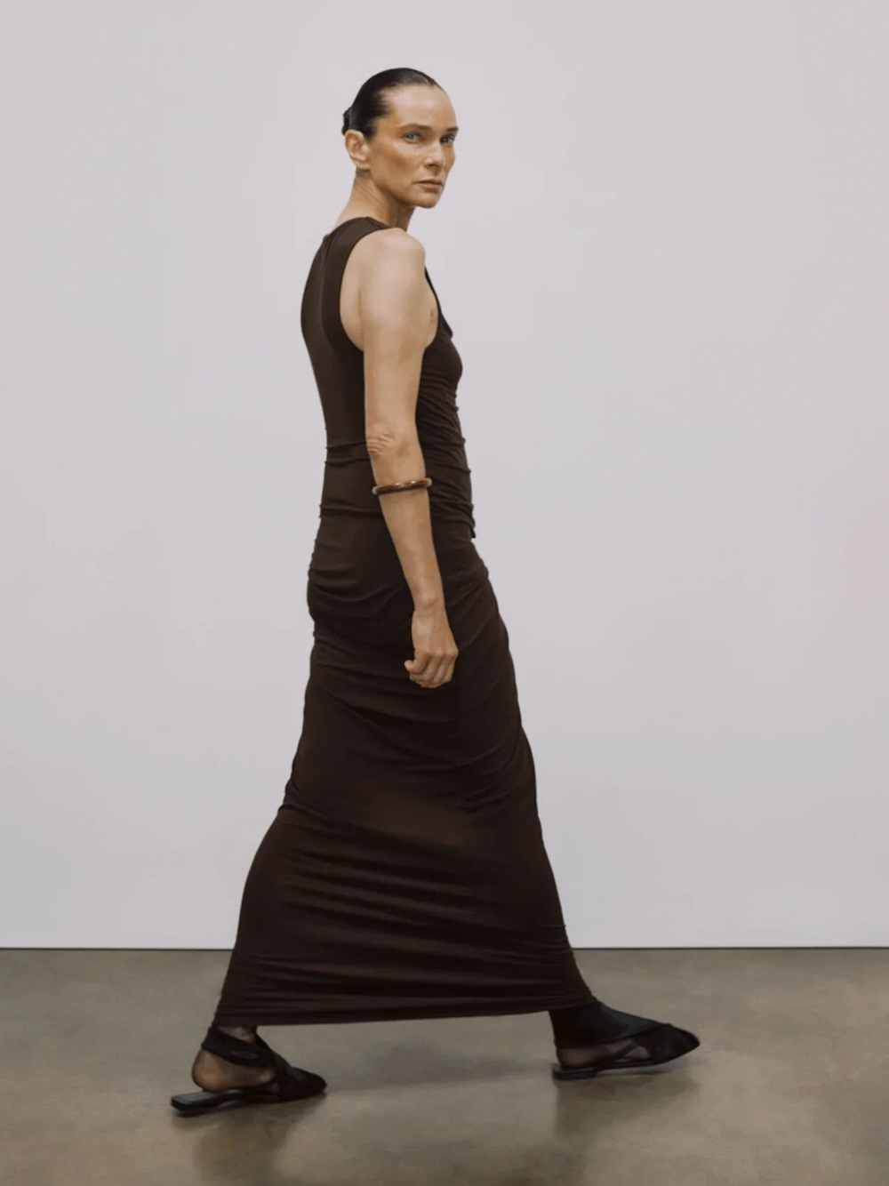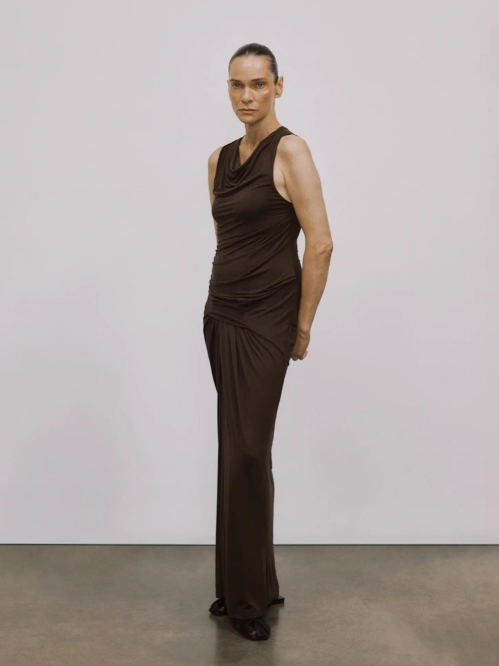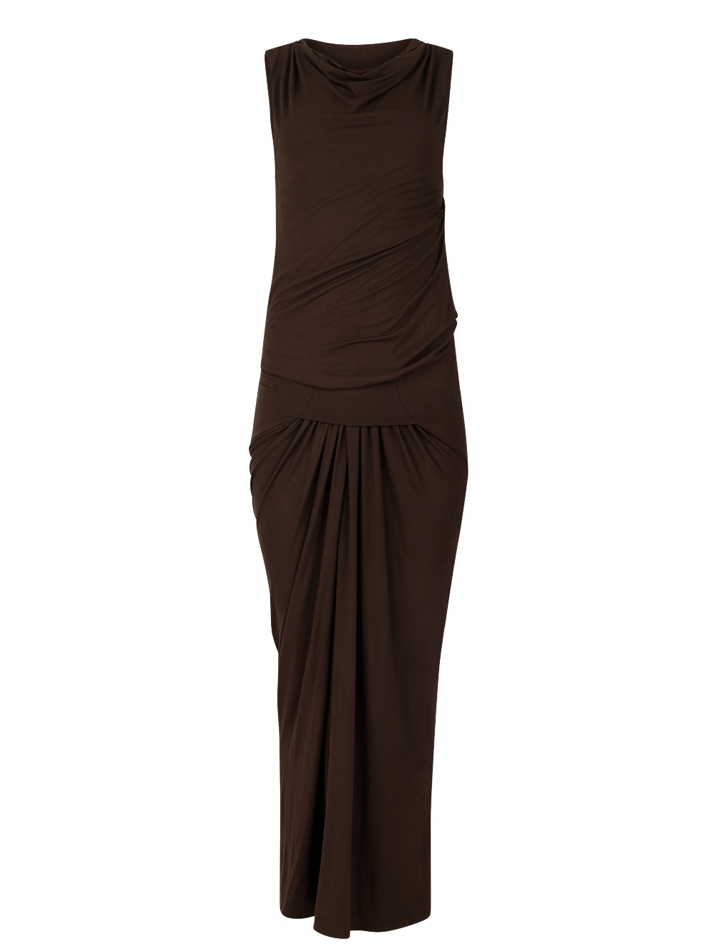 Abito lungo marrone Drape di Entire Studios in viscosa con scollo morbito, dettaglio drappeggiato e orlo dritto.
