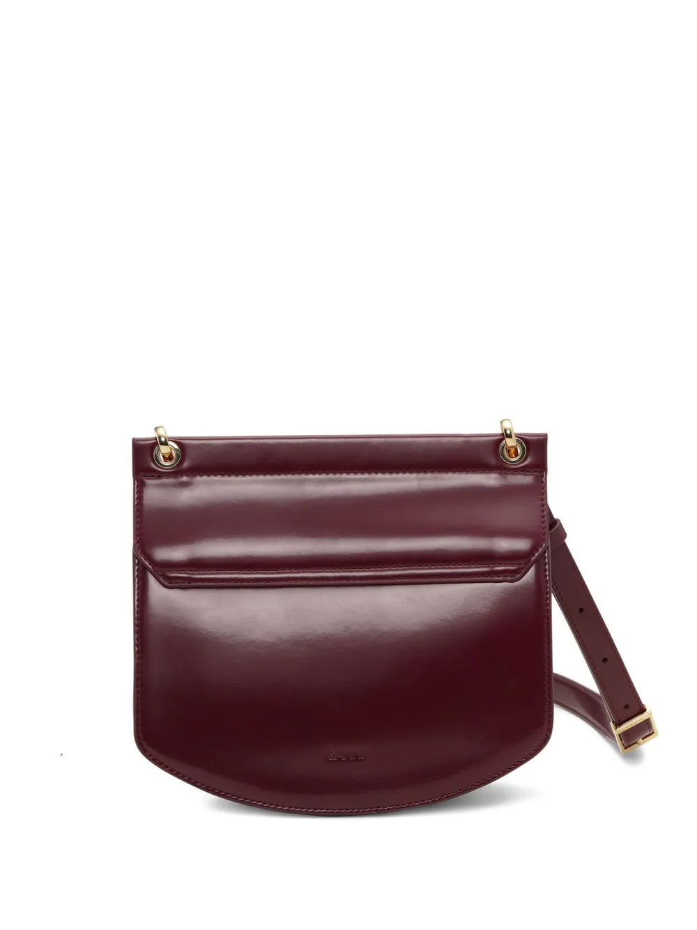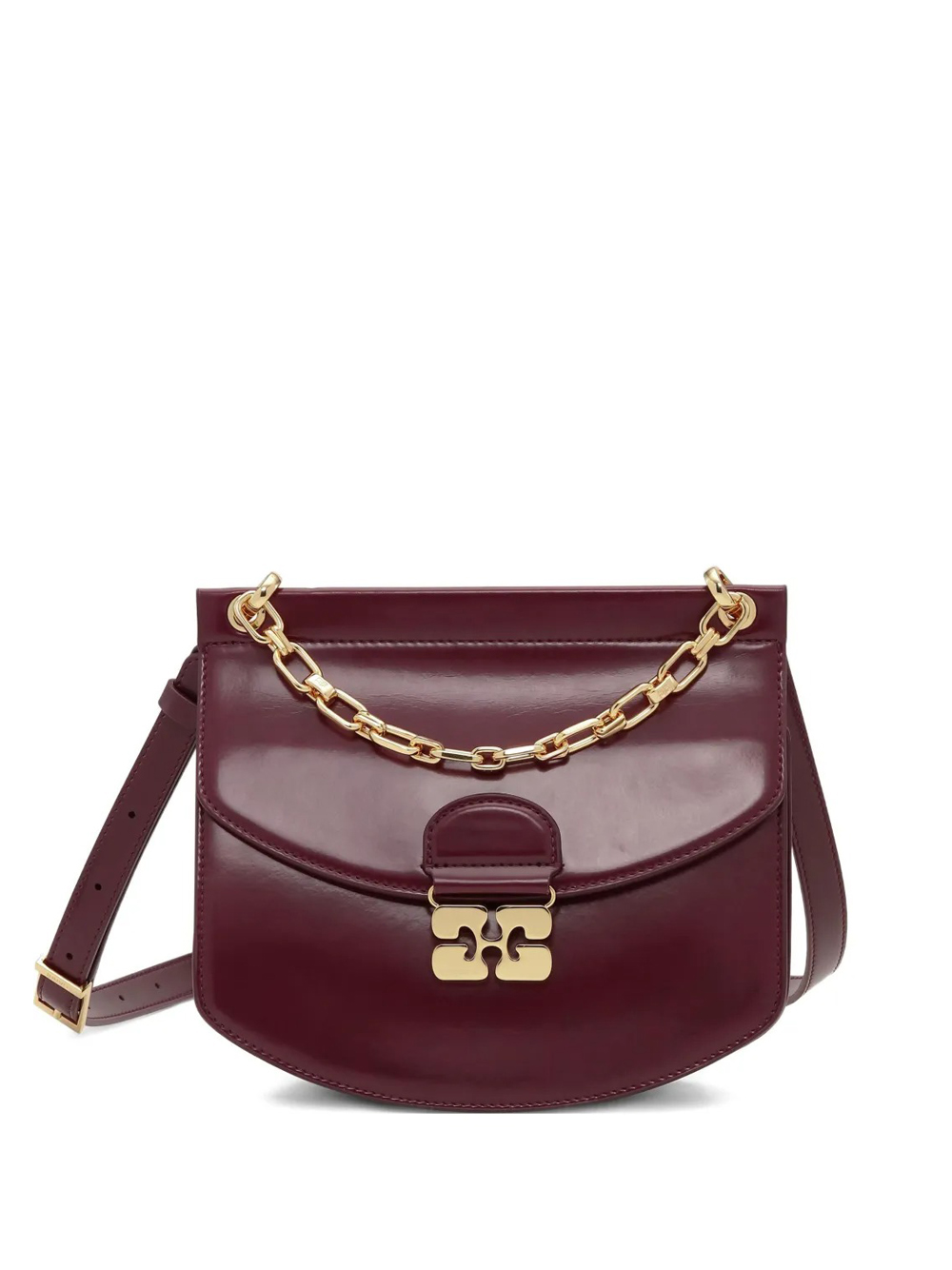 Borsa borgogna Apo-g bag small chain di Ganni in pelle con manico, dettagli color oro, placca con logo,chiusura magnetica, tracolla regolabile e rimovibile.