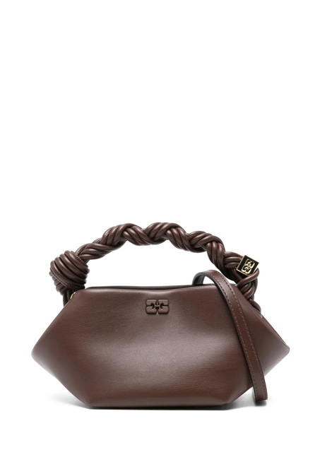 Borsa marrone Bou Mini di Ganni in poliestere con manuco intrecciato, dettagli color oro, placca con logo,chiusura magnetica, tracolla regolabile e rimovibile.