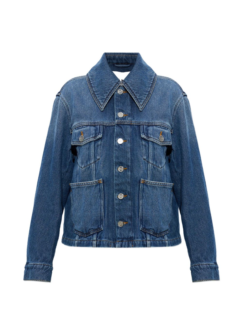 Giacca blu Heavy di Ganni in cotone con chiusura a bottoni, colletto a punta e maniche lunghe.