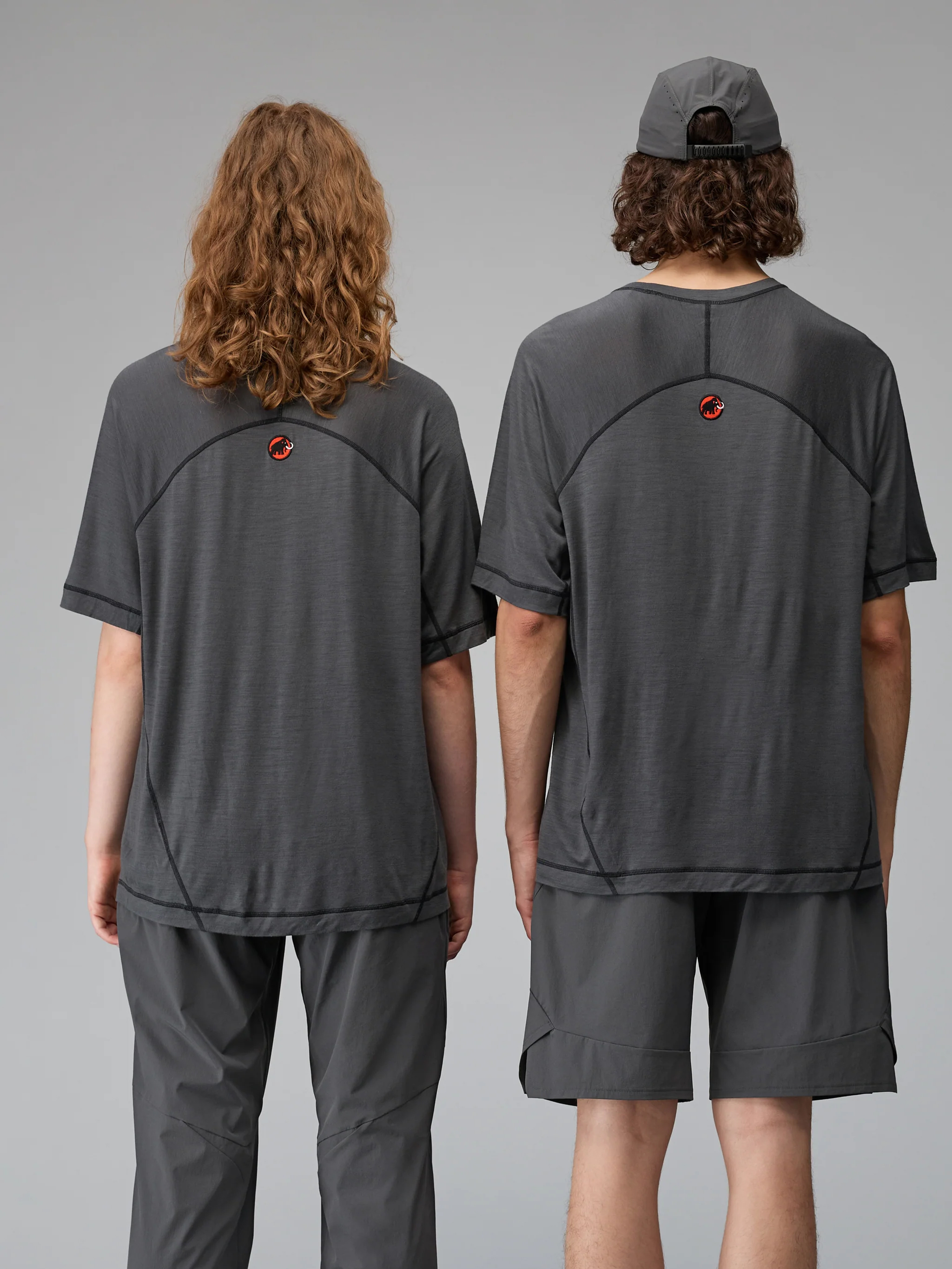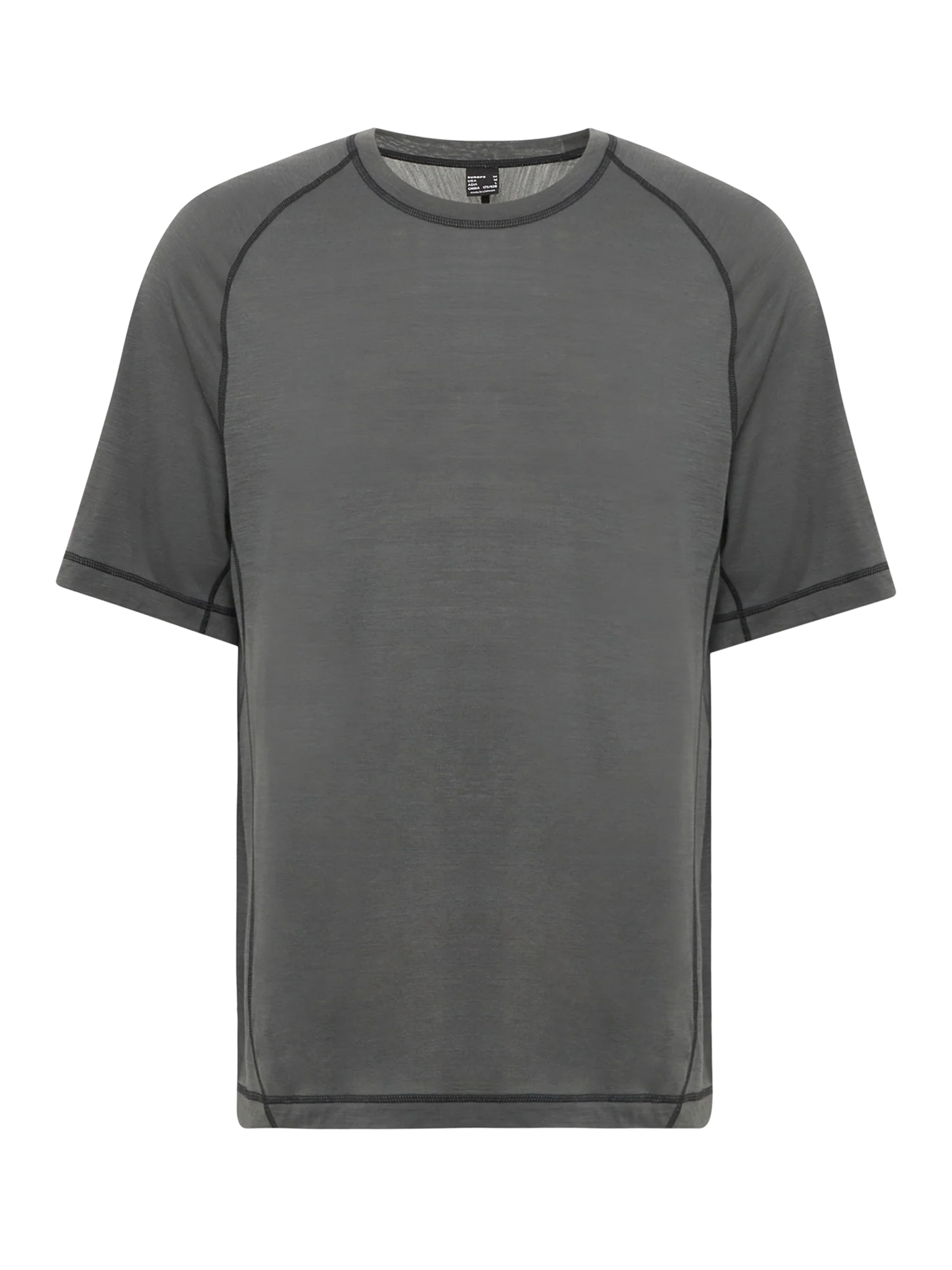 T-shirt grigio scuro Tree Wool FL di Hiking Patrol in misto lyocell con scollo rotondo, maniche corte, logo porteriore e orlo dritto.