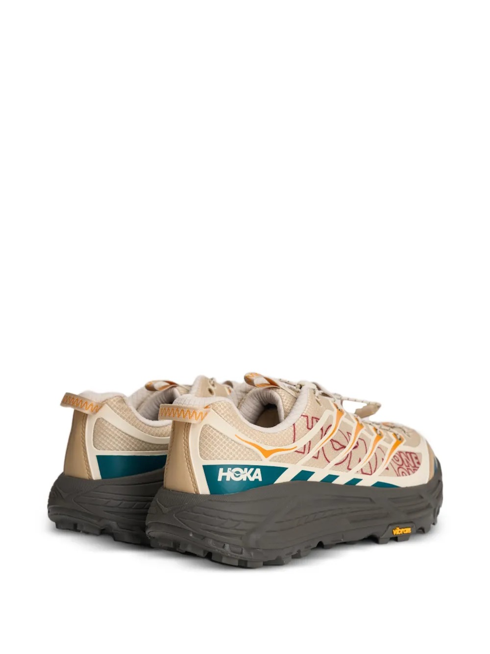 Sneakers crema Mafate Three 2 di Hoka con design a inserti, logo laterale goffrato, stampa con logo laterale, linguetta sul tallone, punta tonda, chiusura frontale con lacci, soletta con logo, suola effetto screziato e suola Vibram®.