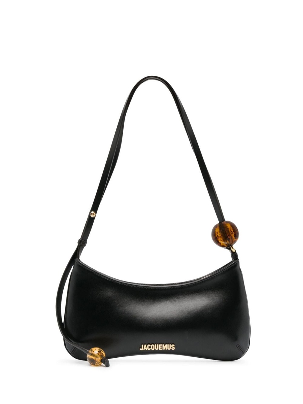 Borsa nera Le Bisou Perle di Jacquemus in pelle con silhouette ondulata, chiusura con zip, tasca interna, applicazione con logo color oro, tracolla a contrasto e dettaglio perla.