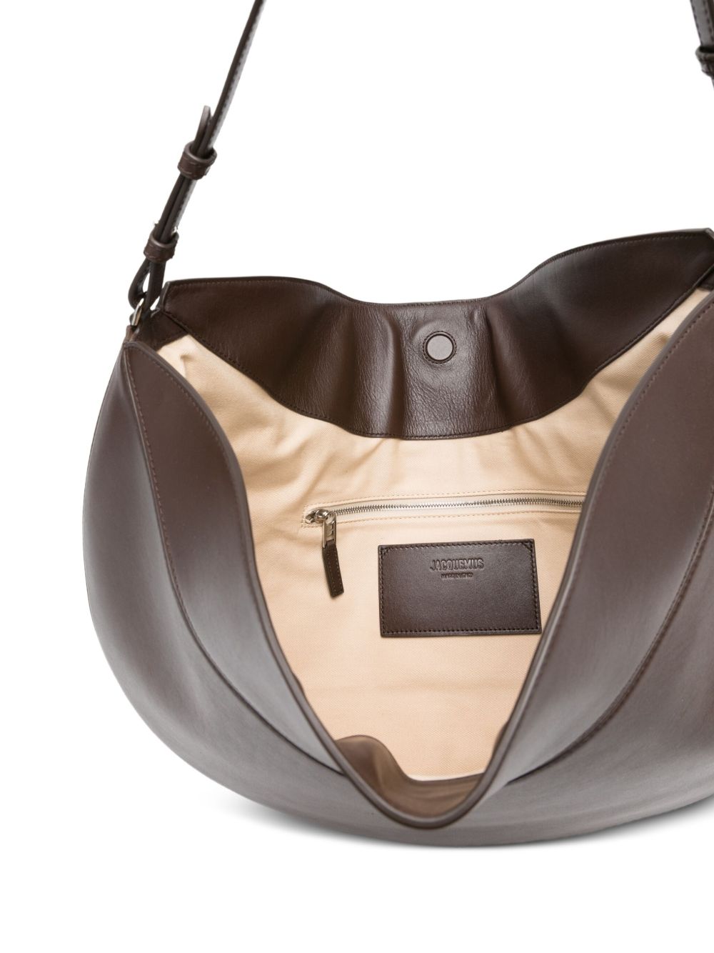 Borsa marrone Le Sac Ovalo di Jacquemus in pelle con chiusura magnetica con patta, logo goffrato, tracolla regolabile e forma a mezza luna.