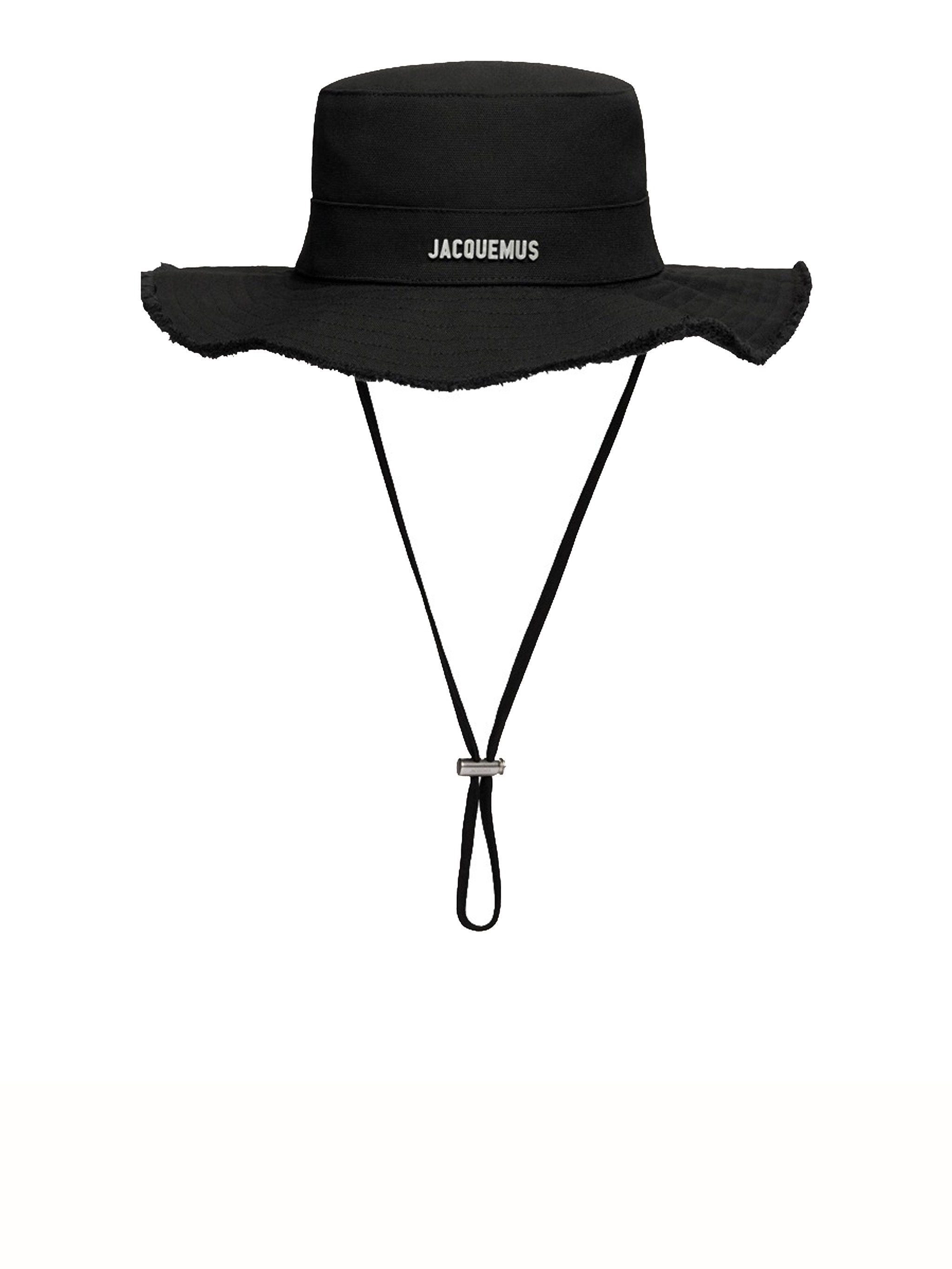 Cappello nero Le Bob Artichaut di Jacquemus in cotone con silhouette da pescatore, coulisse regolabile, applicazione logo in metallo e visiera morbida con bordi sfrangiati.