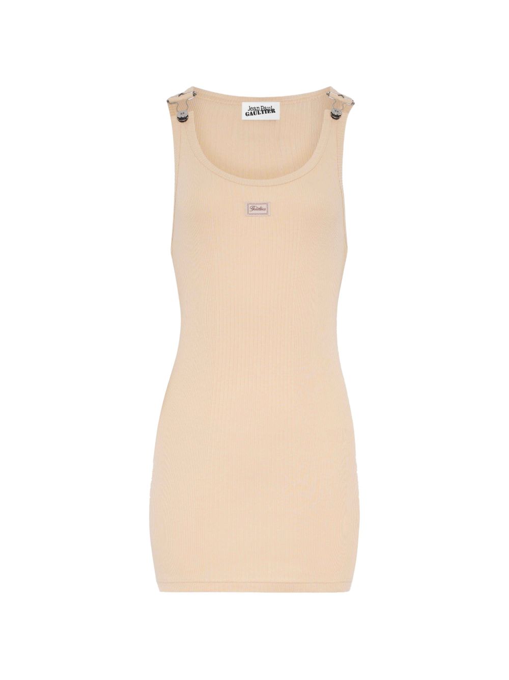 Abito corto nude di Jean Paul Gaultier in cotone con costine , scollo rotondo, design senza maniche, etichetta JPG sul petto e orlo dritto.