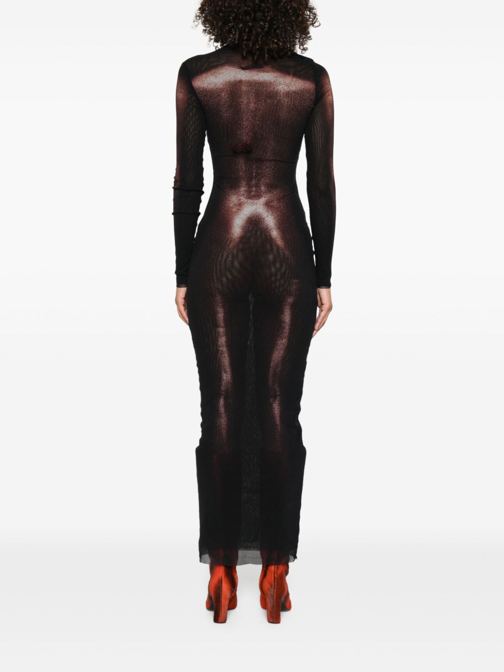 Abito nero e marrone di Jean Paul Gaultier in polimmide con scollo asimmetrico, maniche lunghe, design aderente, stampa all over e orlo dritto.