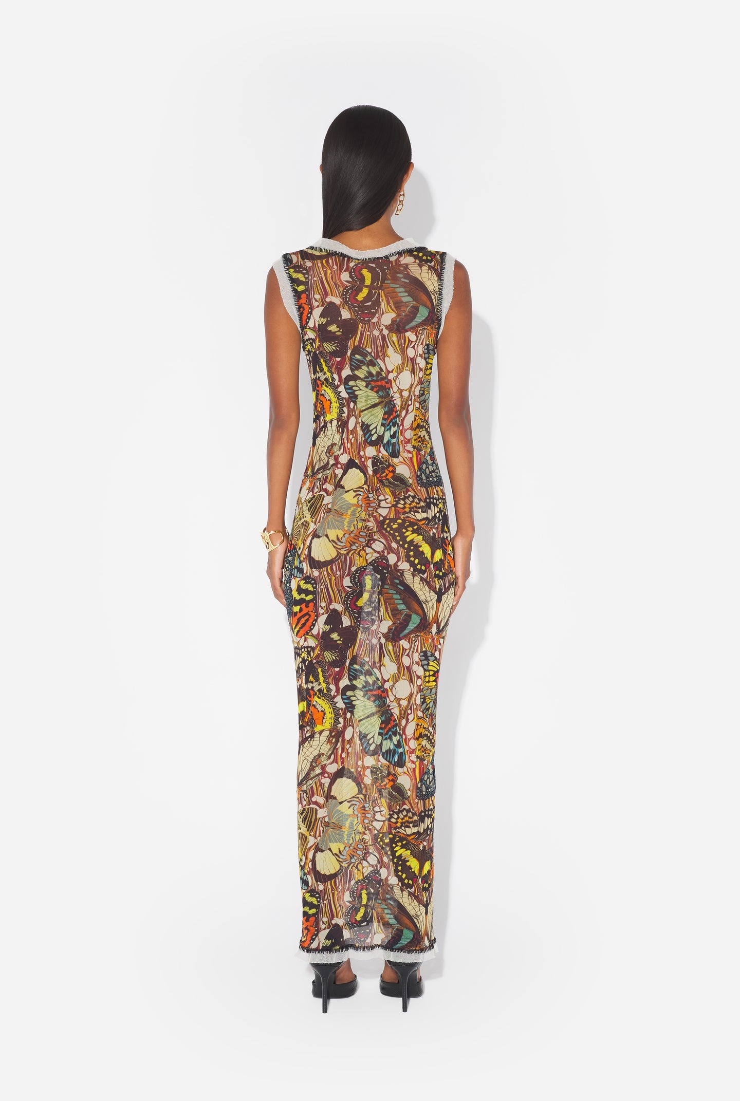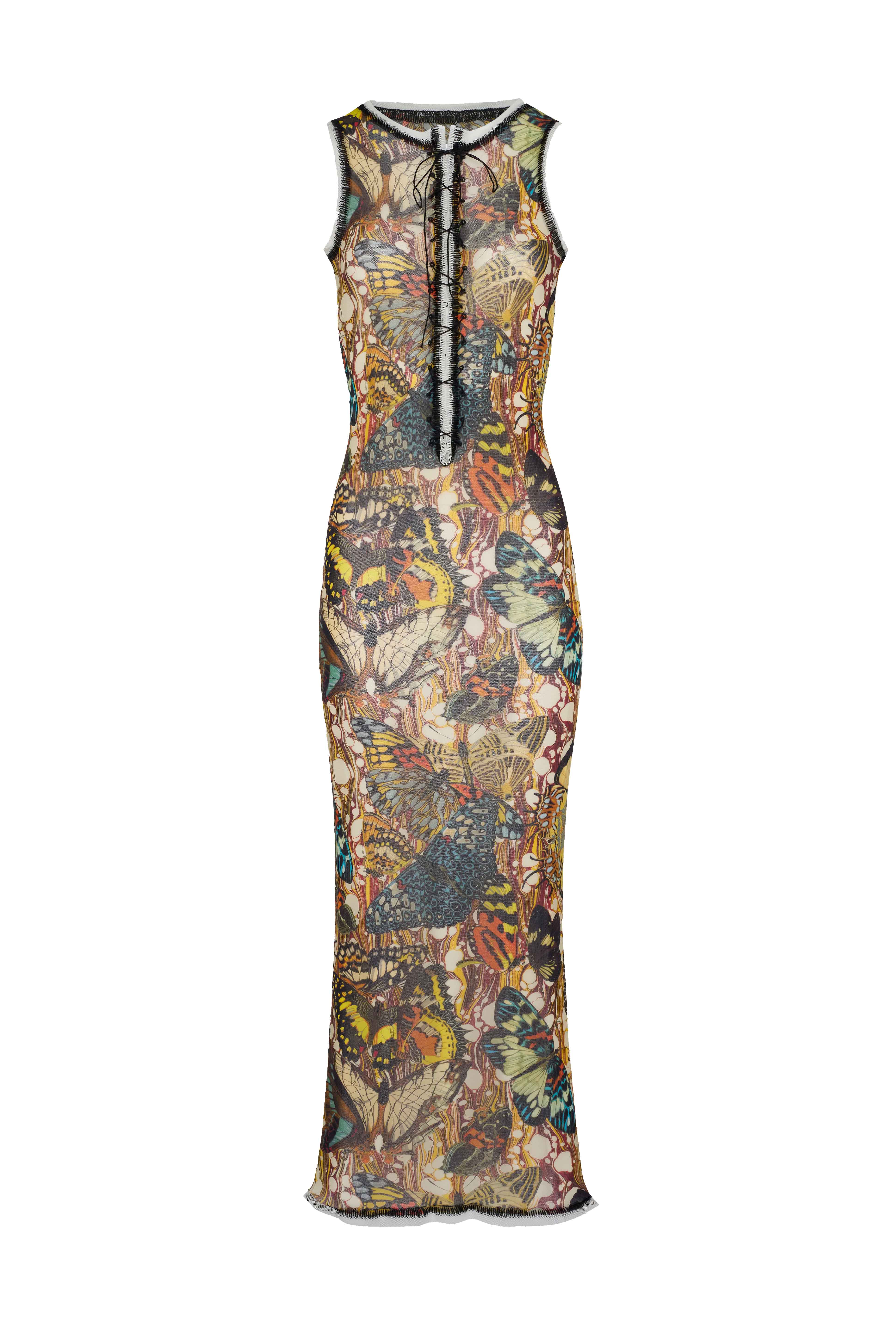 Abito lungo multicollor di Jean Paul Gaultier in polimmide con apertura frontale con lacci design senza maniche e aderente, stampa all over e orlo dritto.