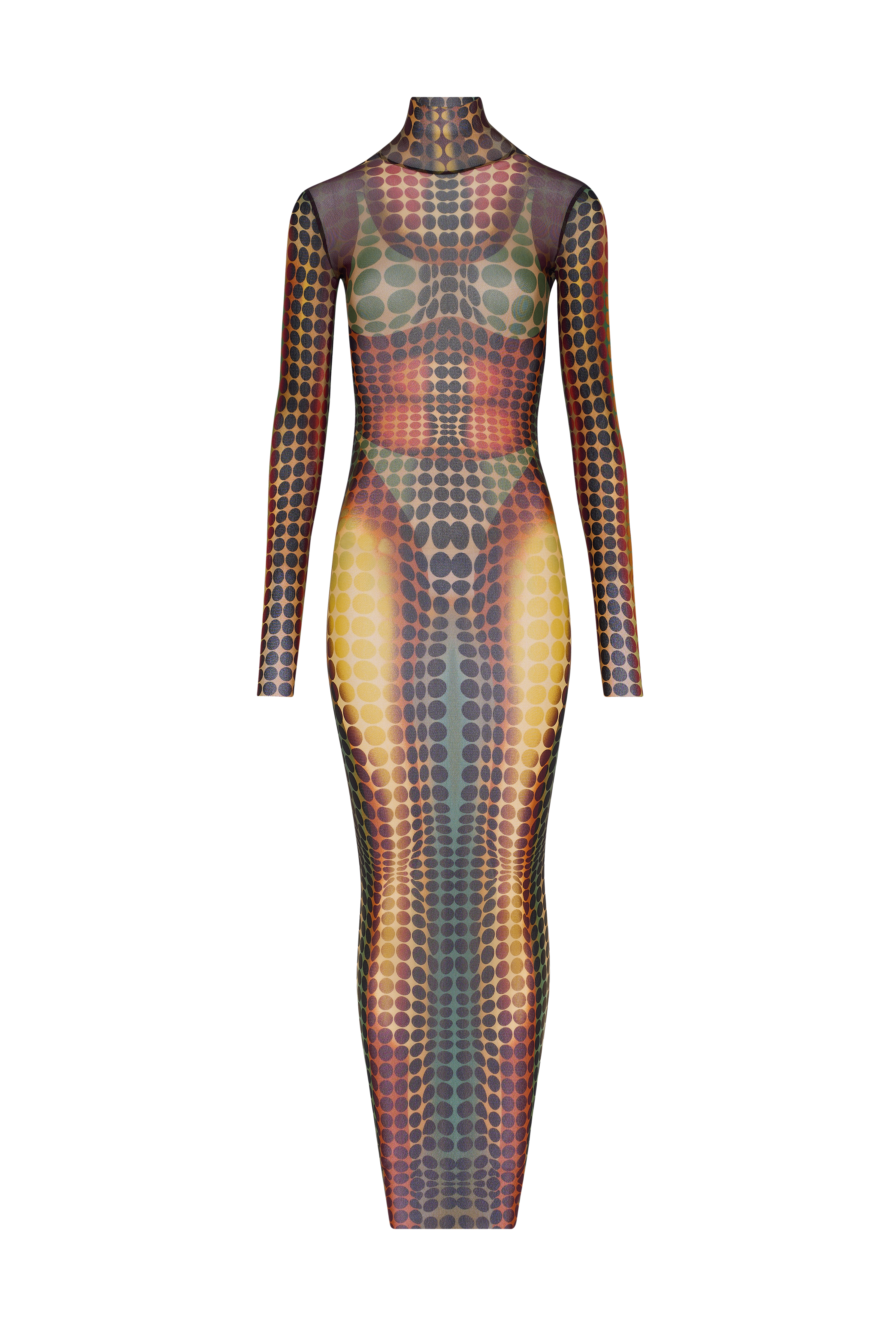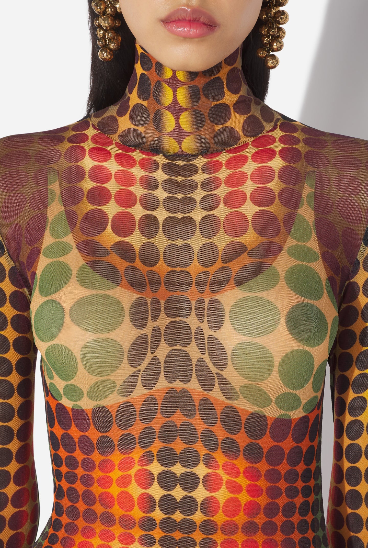 Abito multicolor di Jean Paul Gaultier in polimmide con collo alto, maniche lunghe, design aderente, stampa all over e orlo dritto.