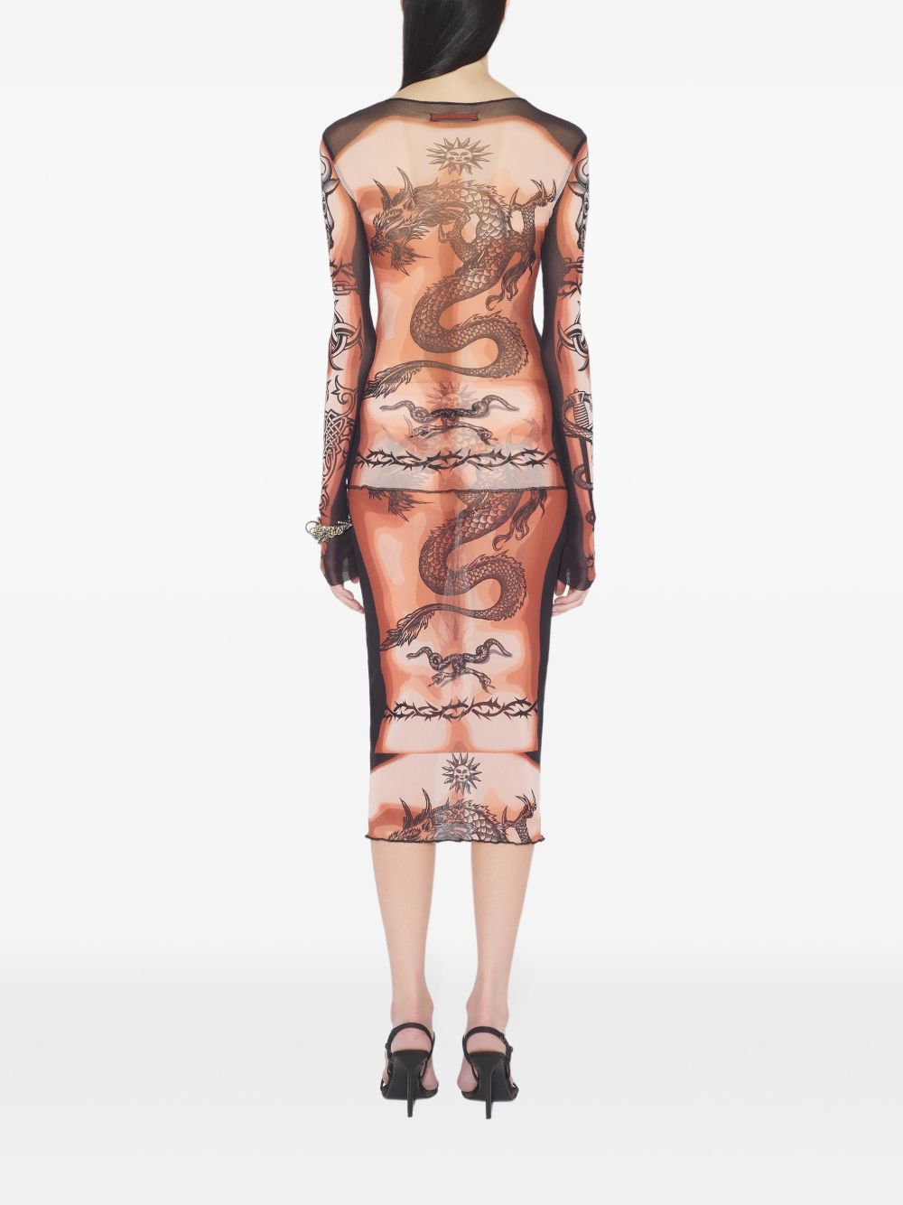 Top nude marrone e nero di Jean Paul Gaultier in poliammide con girocollo, maniche lunghe, stampa all-over e orlo dritto.