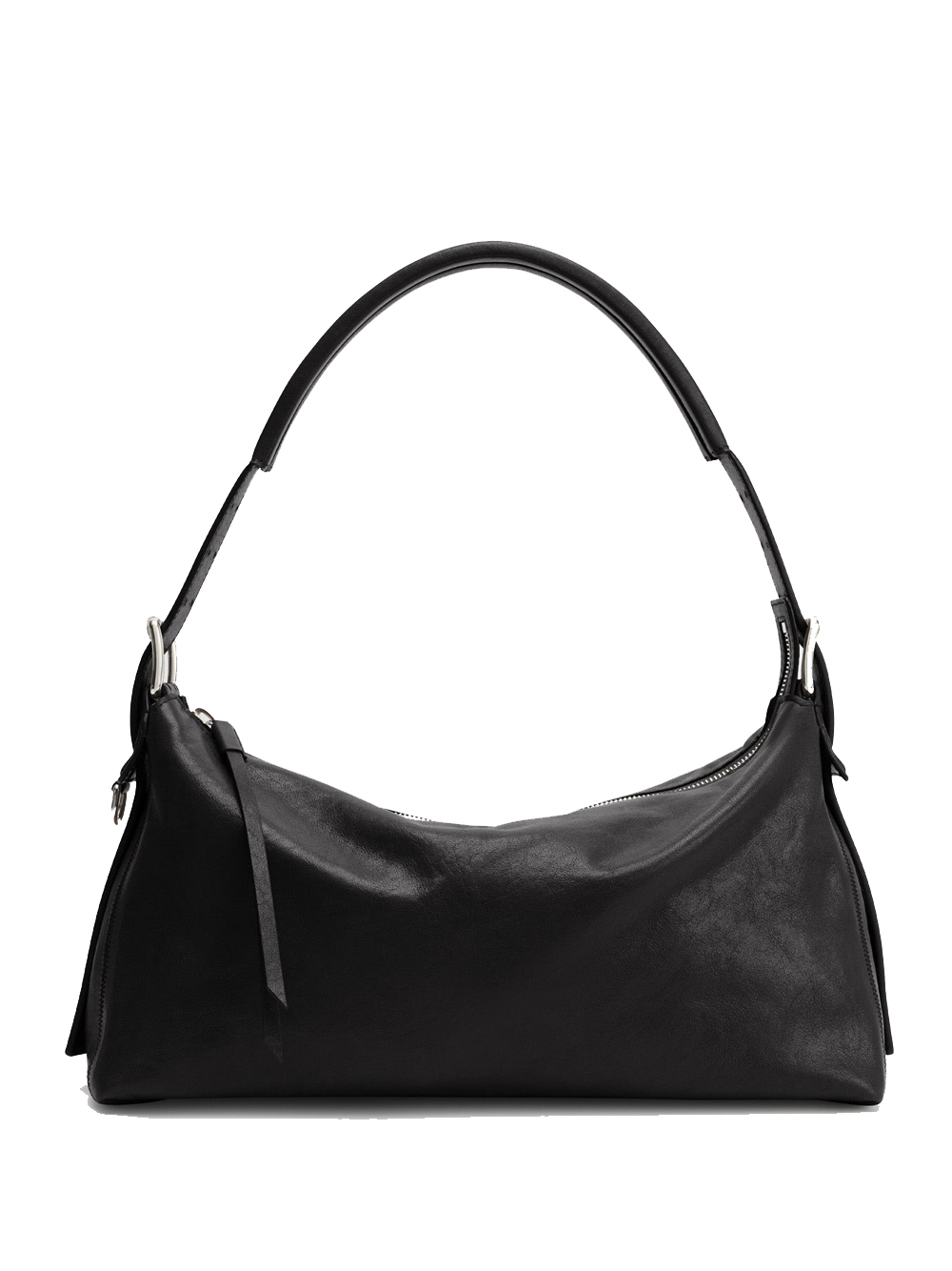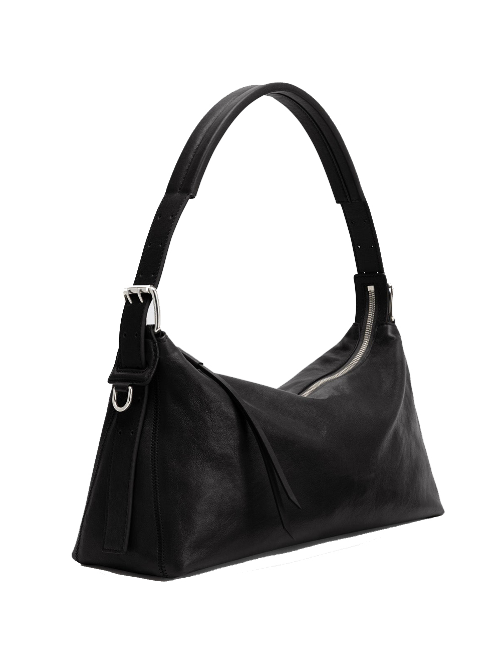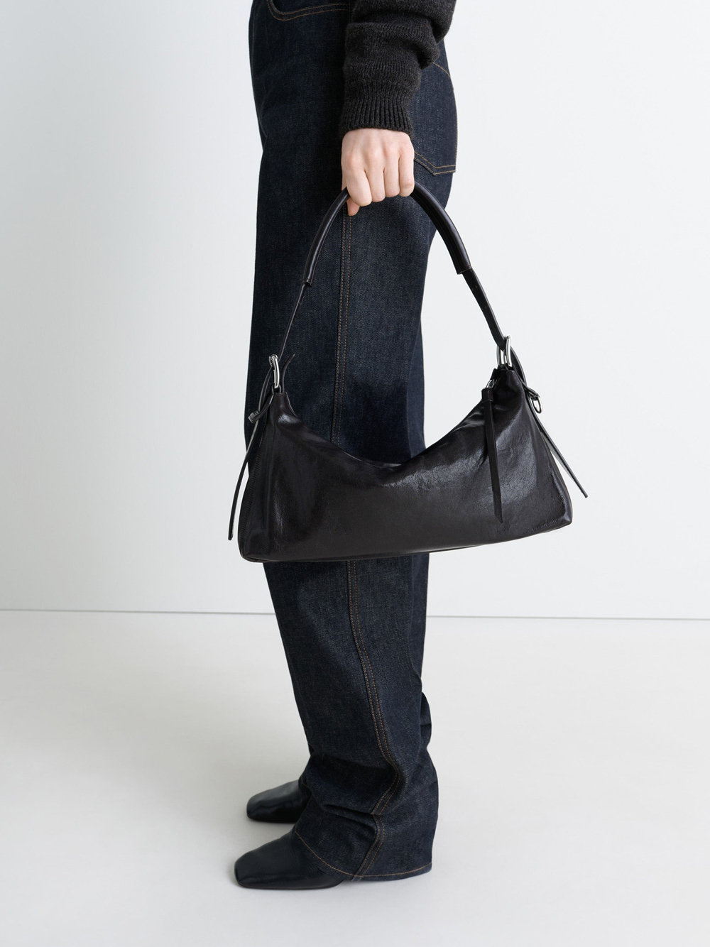 Borsa marrone scuro (Dark Chocolate) Belted Baguette di Lemaire in pelle con tracolla manico regolabile, chiusura con zip con tirante, interno con tasca con zip.