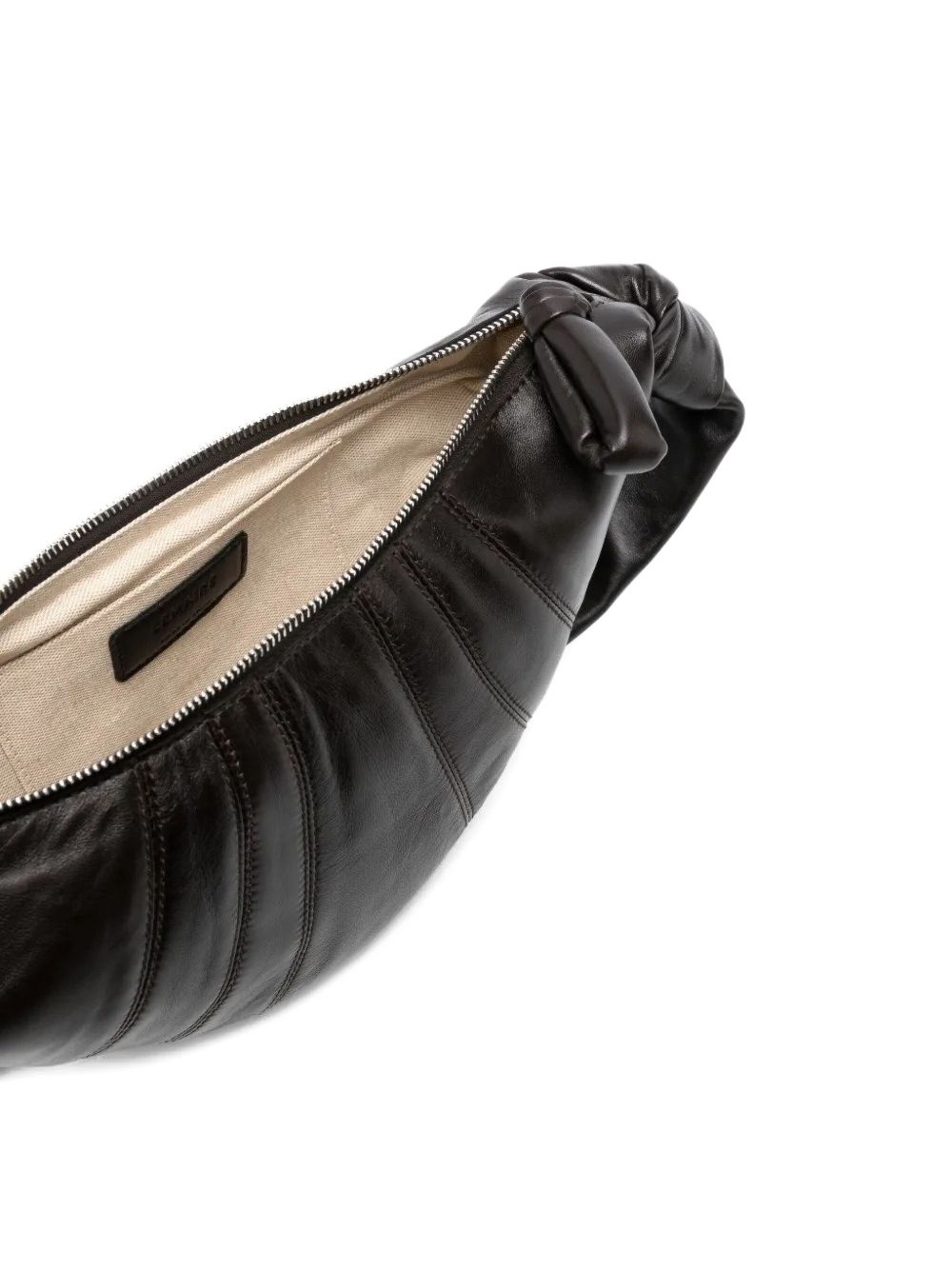 Borsa marrone scuro ( Dark Chocolate) Croissant Small di Lemaire in pelle con chiusura con zip, manico singolo, tasca esterna laterale con zip e cuciture tono su tono.
