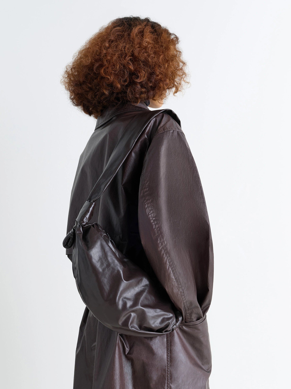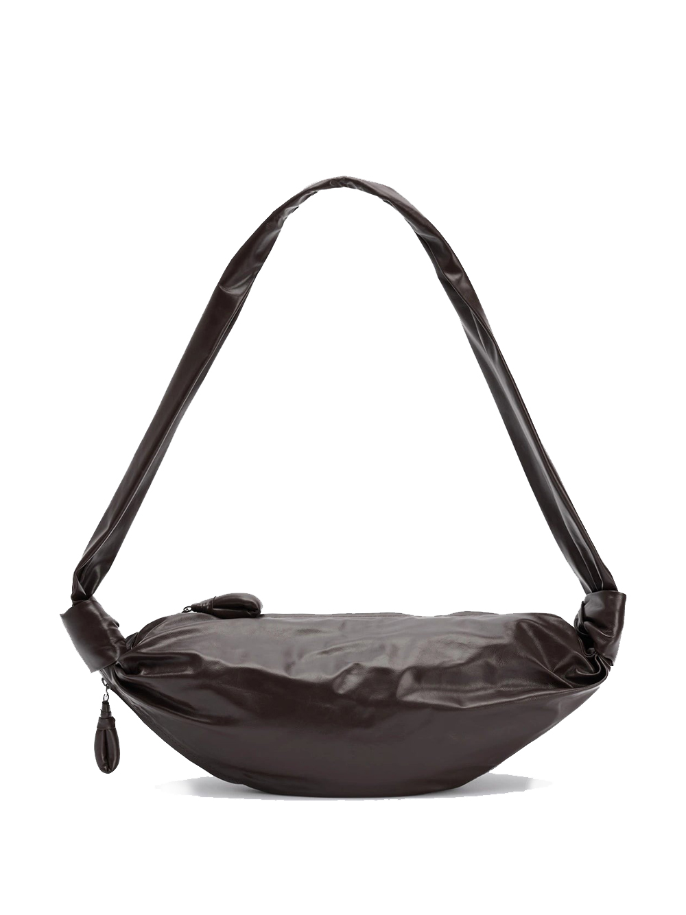 Borsa Small Soft Croissant di Lemaire in pelle effetto carta color Dark Chocolate , modello morbido con pieghe laterali e dettagli a nodo sulla tracolla, tasca laterale con zip e tasca interna con zip in twill di cotone, chiusura con zip, etichetta interna in pelle con logo impresso