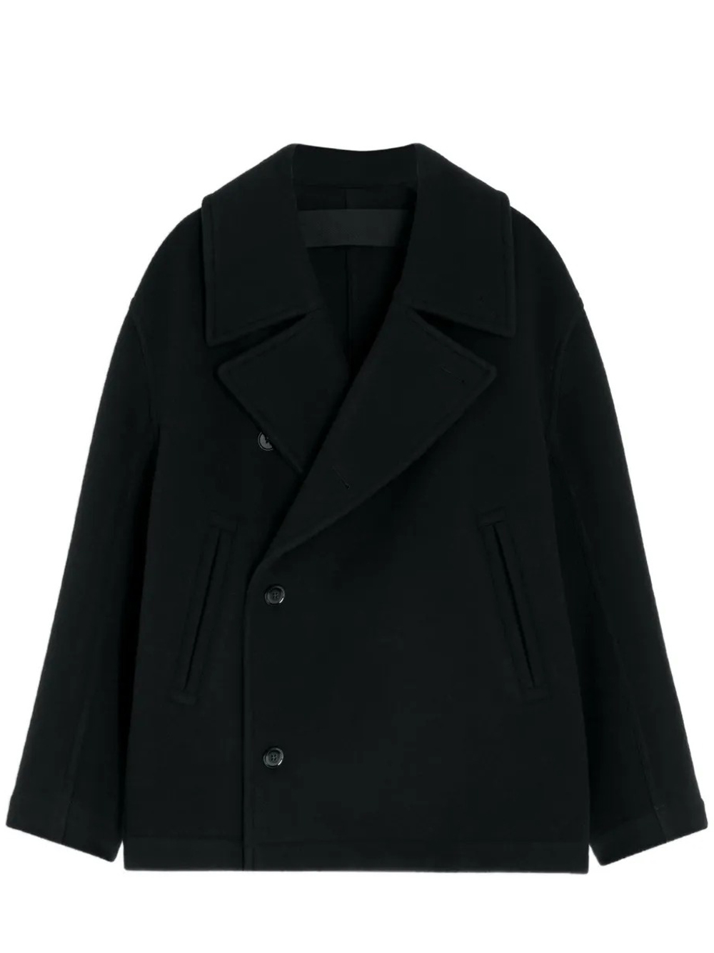 Giacca nera Boxy Peacoat di Lemaire in lana doppio faccia con chiusura doppiopetto, colletto a revers, tasche laterali a filetto, taglio oversize.
