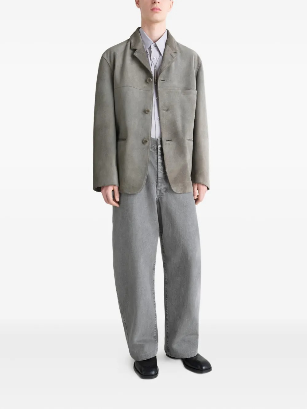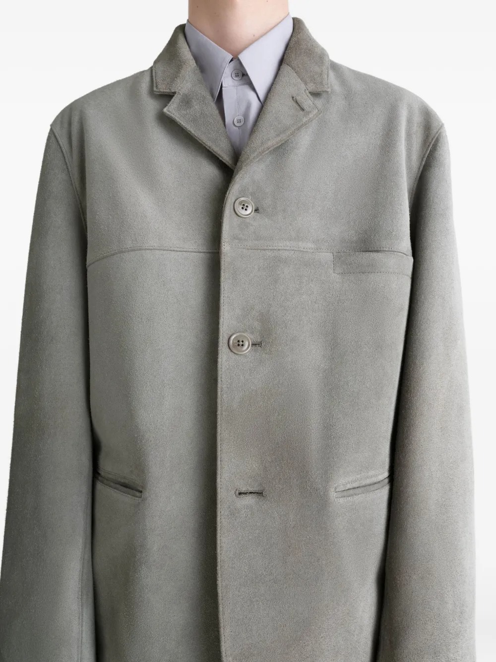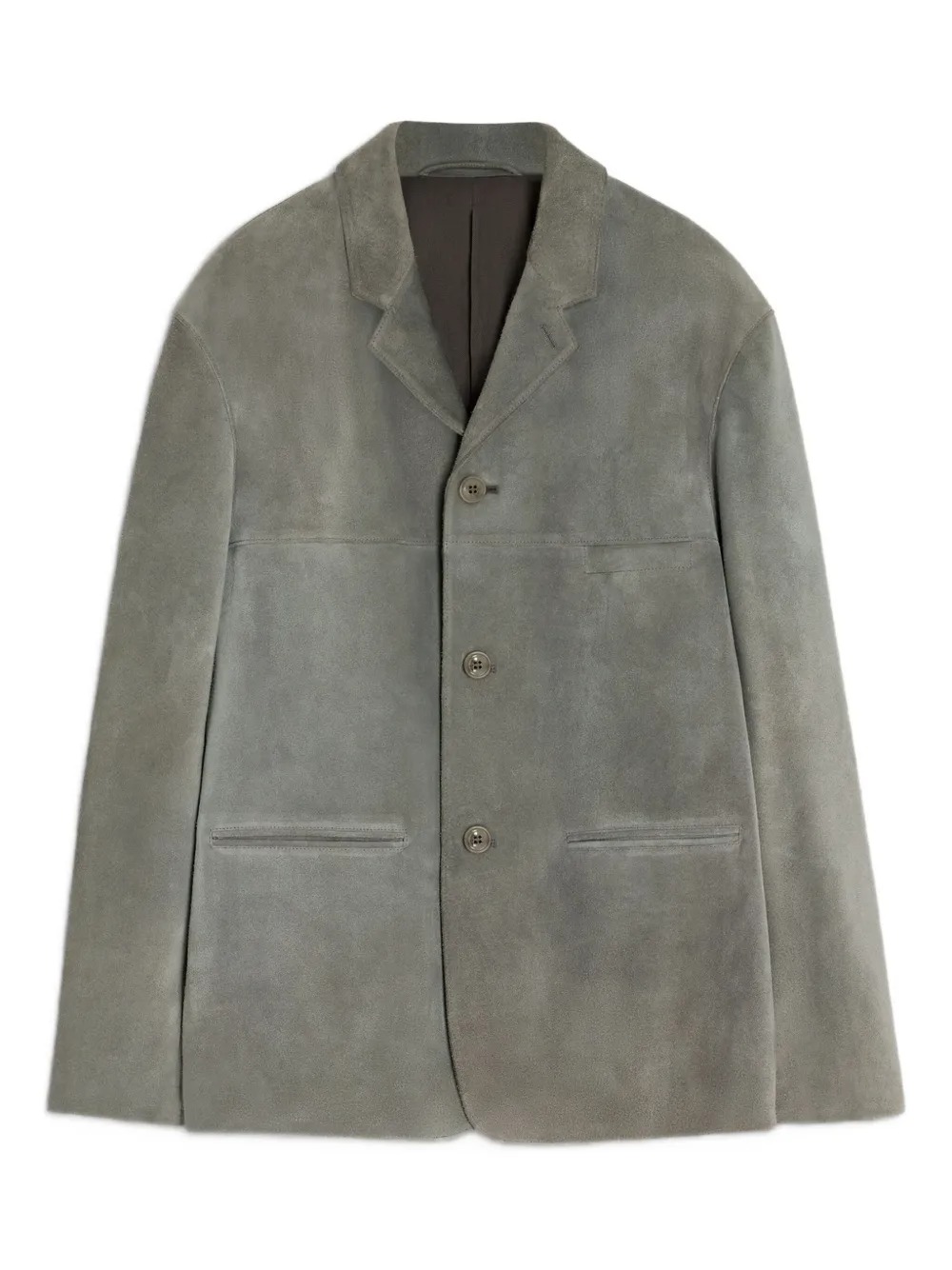 Giacca grigia Suede Single Breasted di Lemaire in pelle scamosciata con finitura spazzolata, colletto sartoriale, chiusura con bottoni, tasche ad aletta e tasca a filetto sul petto.