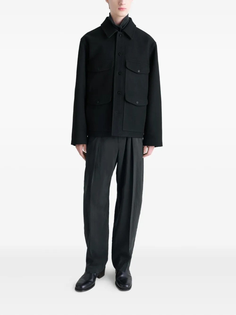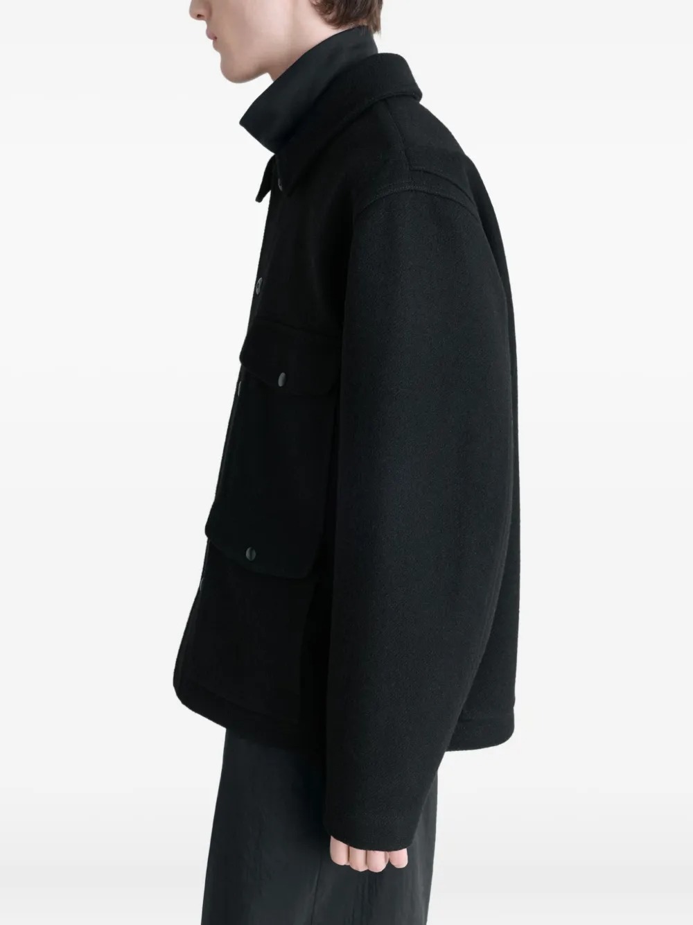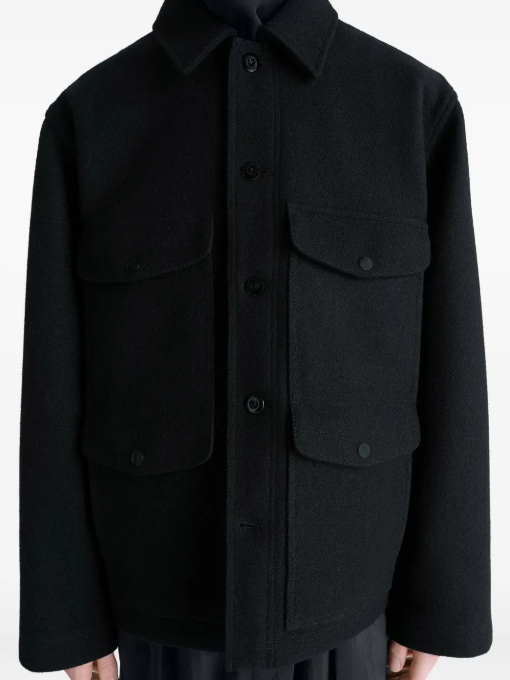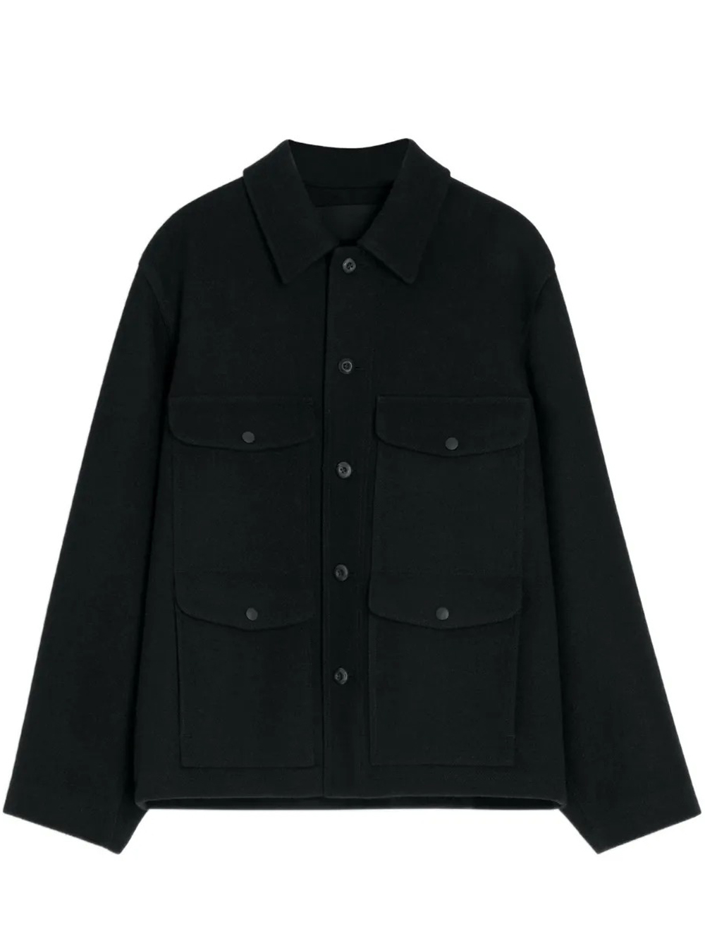 Giacca nera Utility Jacket di Lemaire in lana melton con colletto camicia, chiusura frontale con bottoni, quattro tasche a toppa con pattina e tasca interna con bottone.