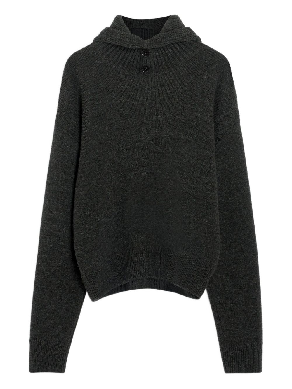 Maglione con cappuccio marrone scuro (Dark Espresso) Hooded Sweater di Lemaire in misto alpaca, lana e acrilico, taglio dritto, chiusura frontale con bottoni, cappuccio a coste, polsini e orlo a costine.