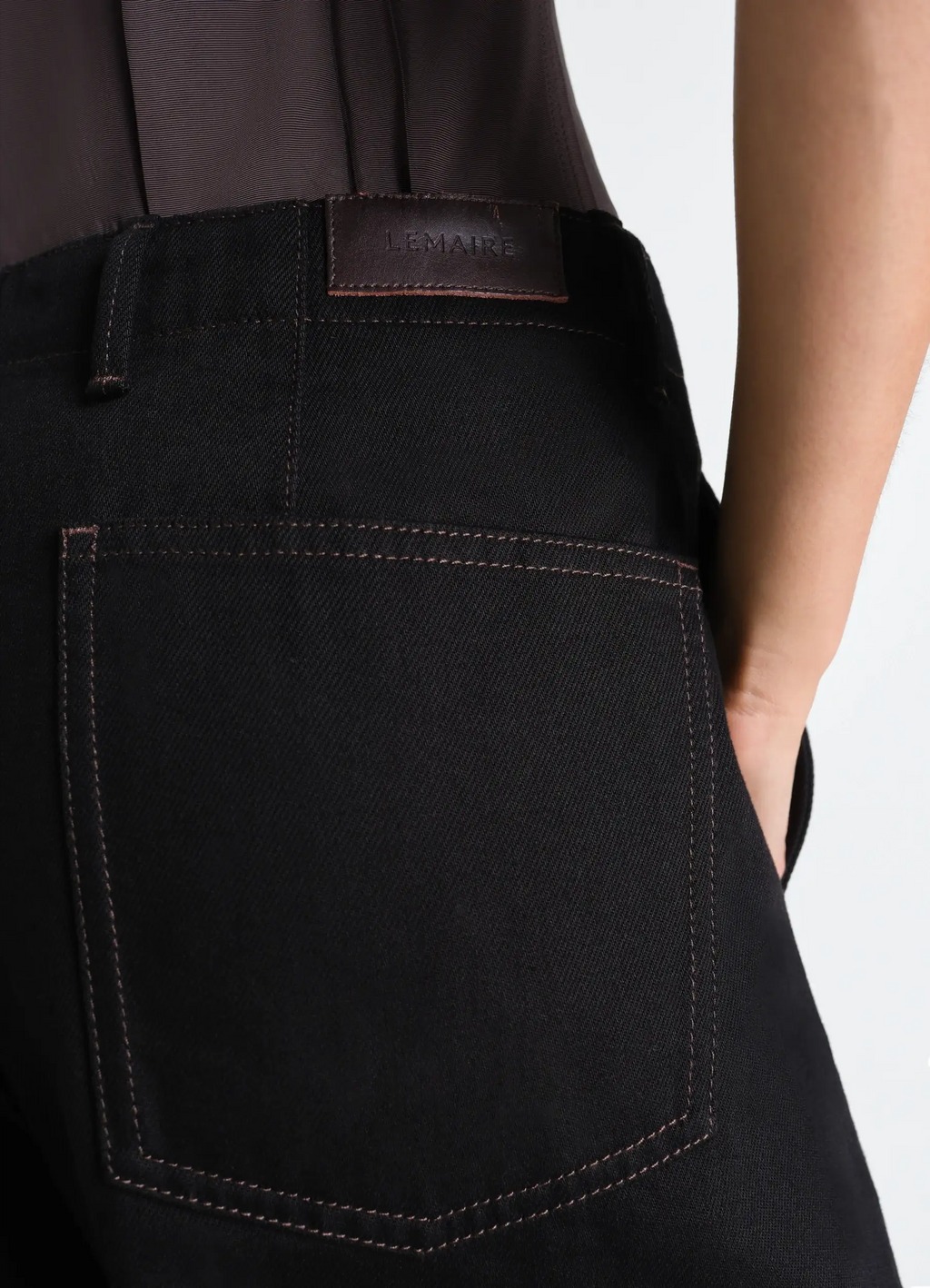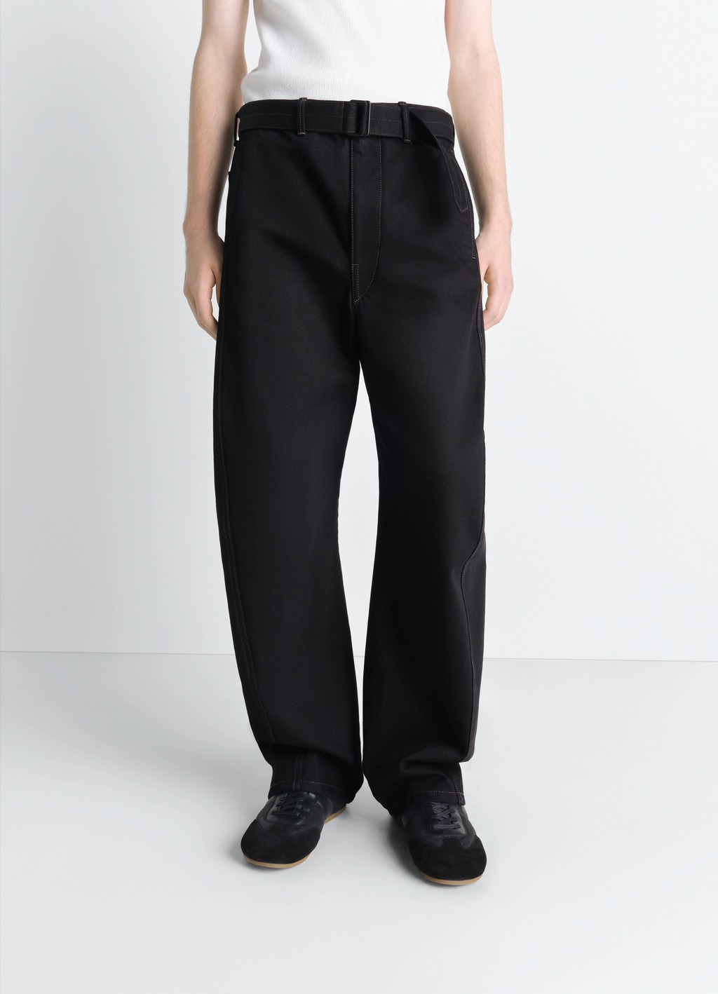 Pantaloni neri Twisted Belted di Lemaire in cotone con cuciture a contrasto, tasche oblique e chiusura con bottoni.