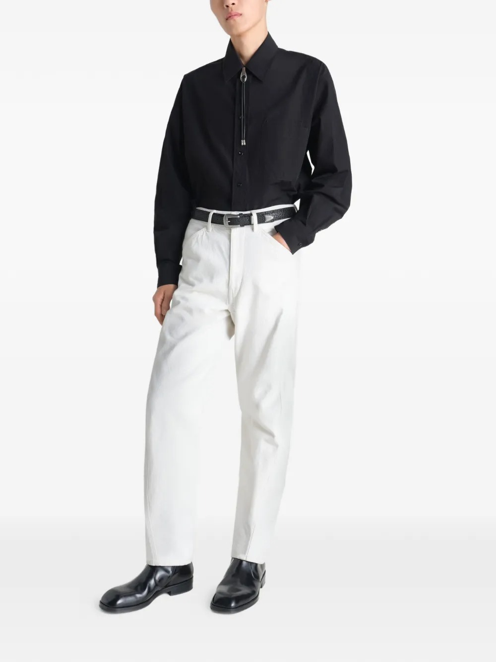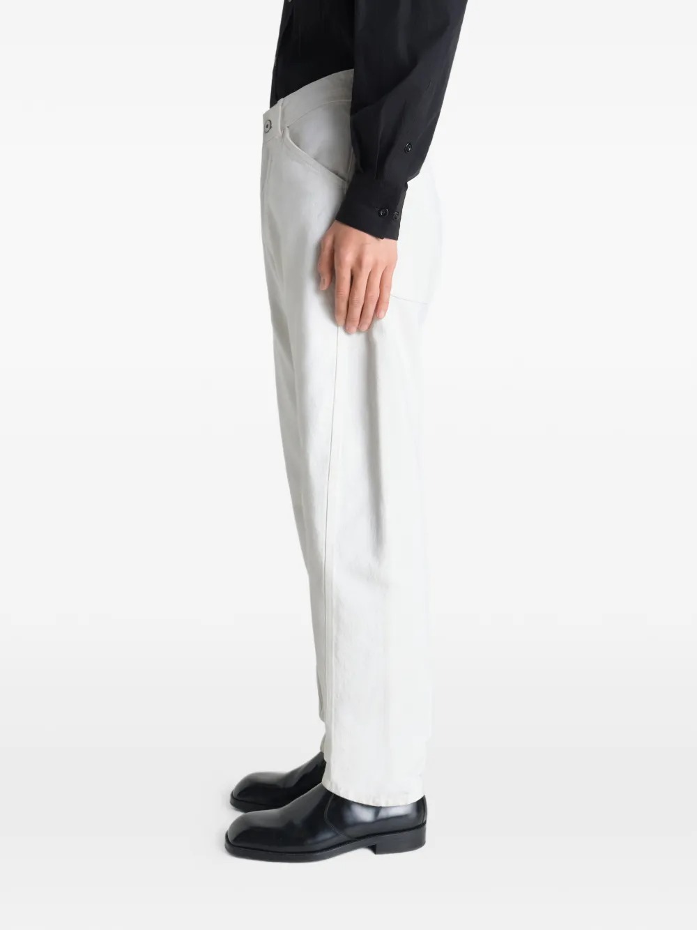 Pantaloni bianchi Twisted Workwear di Lemaire in denim pesante di cotone, vita media, chiusura con bottone e zip nascosta, tasche laterali, tasche posteriori a toppa, tasca laterale con cuciture a contrasto, cuciture laterali torcenti, gamba affusolata e curvata, passanti per cintura, etichetta in pelle con logo sul retro.