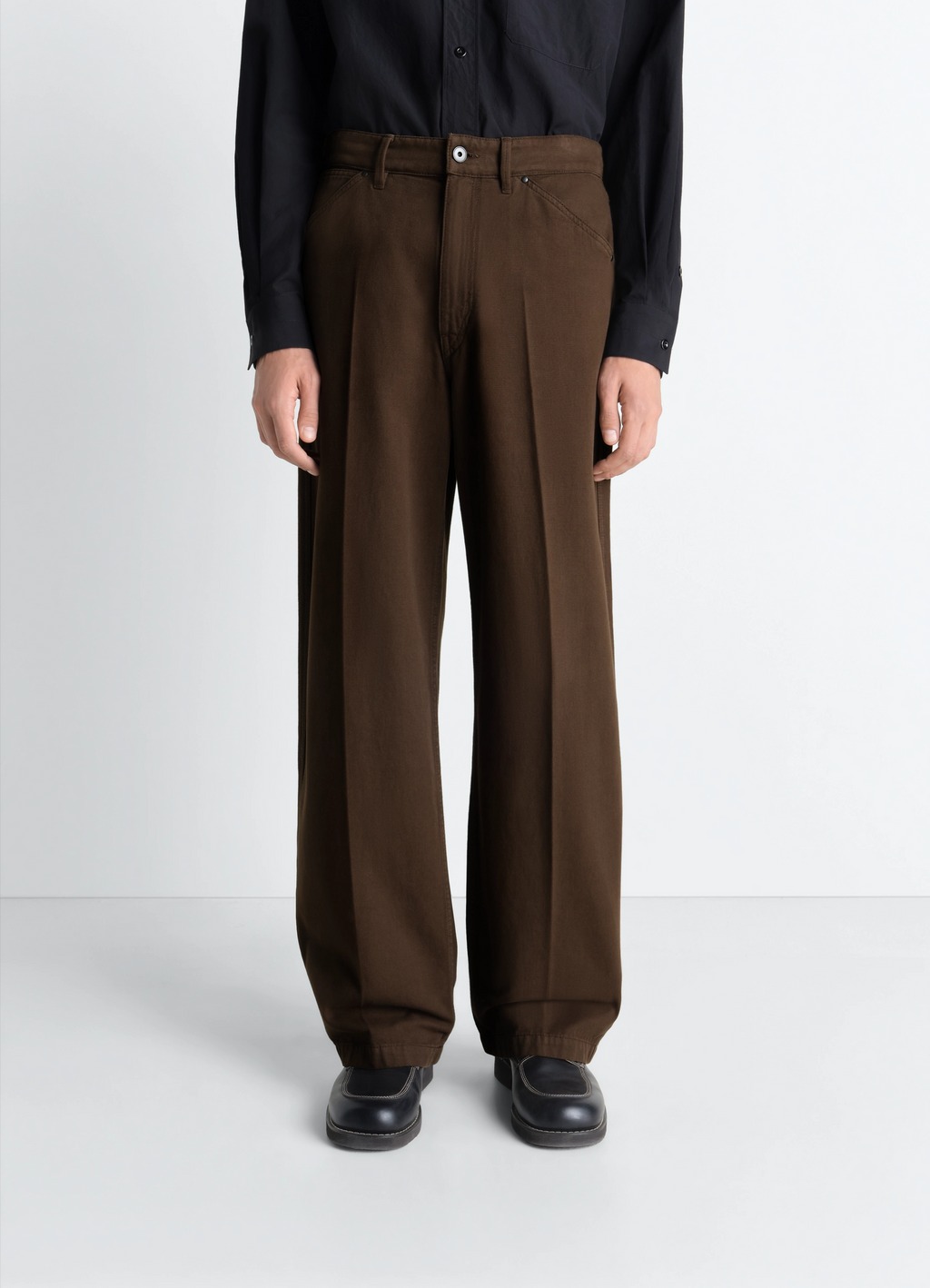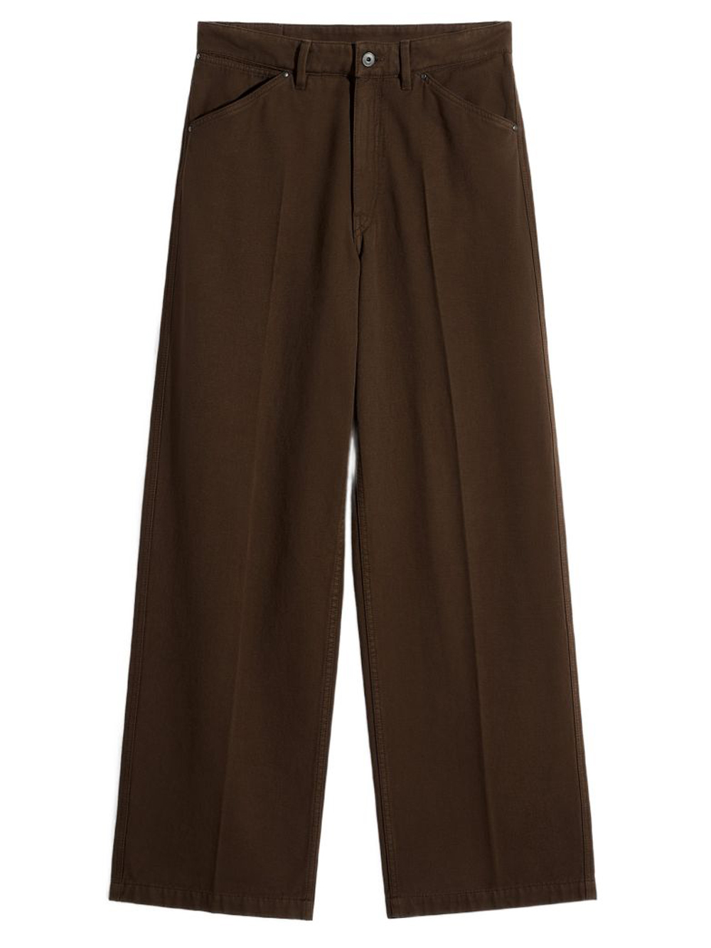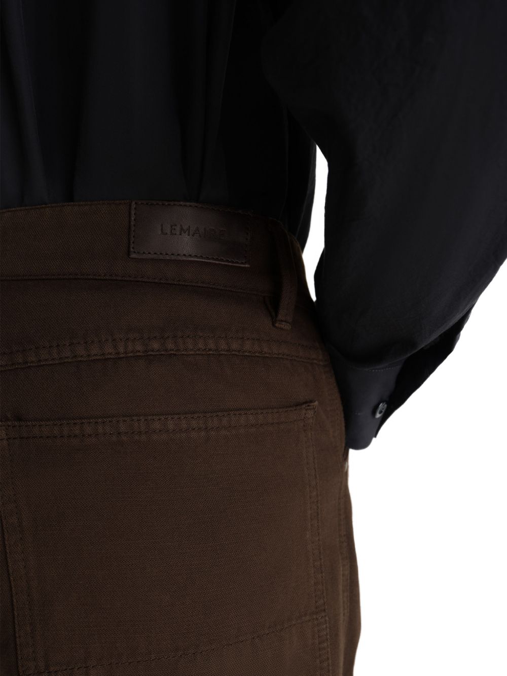 Pantaloni cacao Wide di Lemaire in cotone con vita con passanto, chiusura frontale con bottone ezip nascosta, tasche laterali e posteriori e etichetta in pelle con logo sul retro.