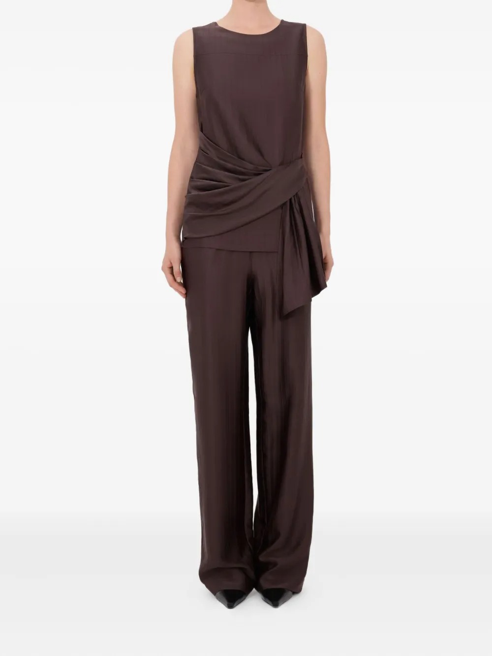 Top marrone di LouLou De Saison in seta con motivo a righe, dettaglio drappeggiato, senza maniche, girocollo e chiusura posteriore con zip nascosta.