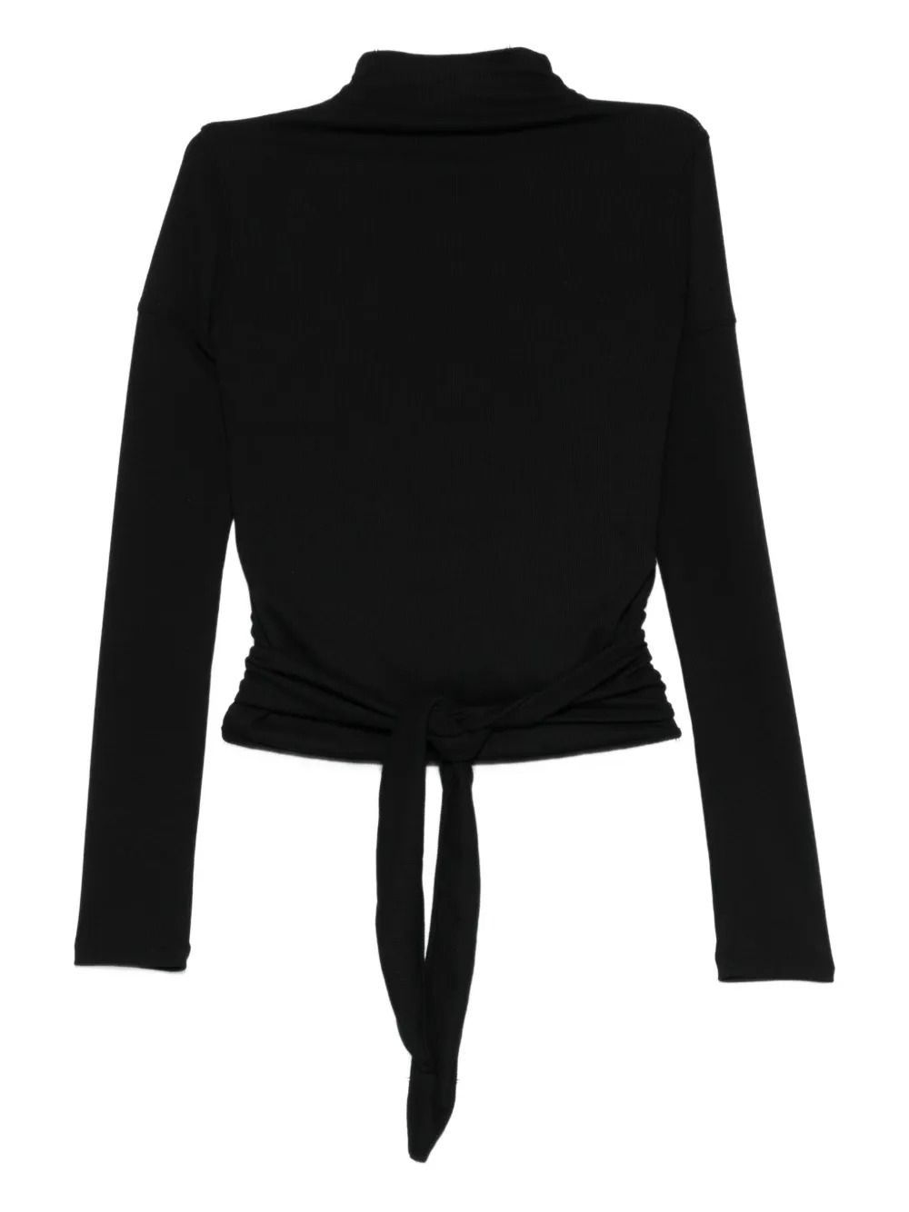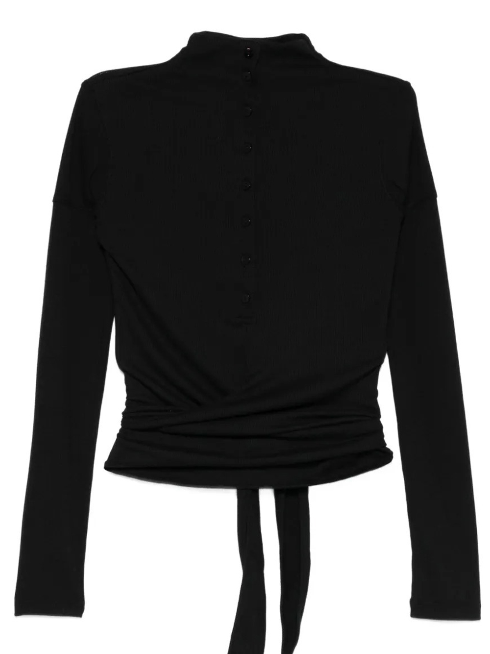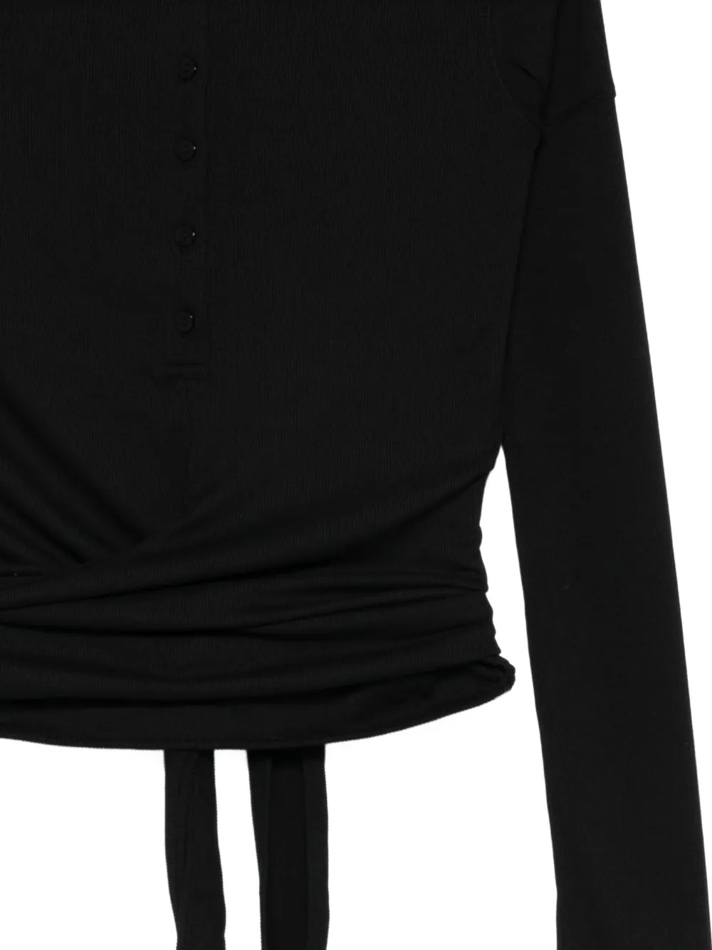 T-shirt nera di Low Classic in poliestere con falsatura frontale con abbottonatura, maniche lunghe e dettaglio con nodo.