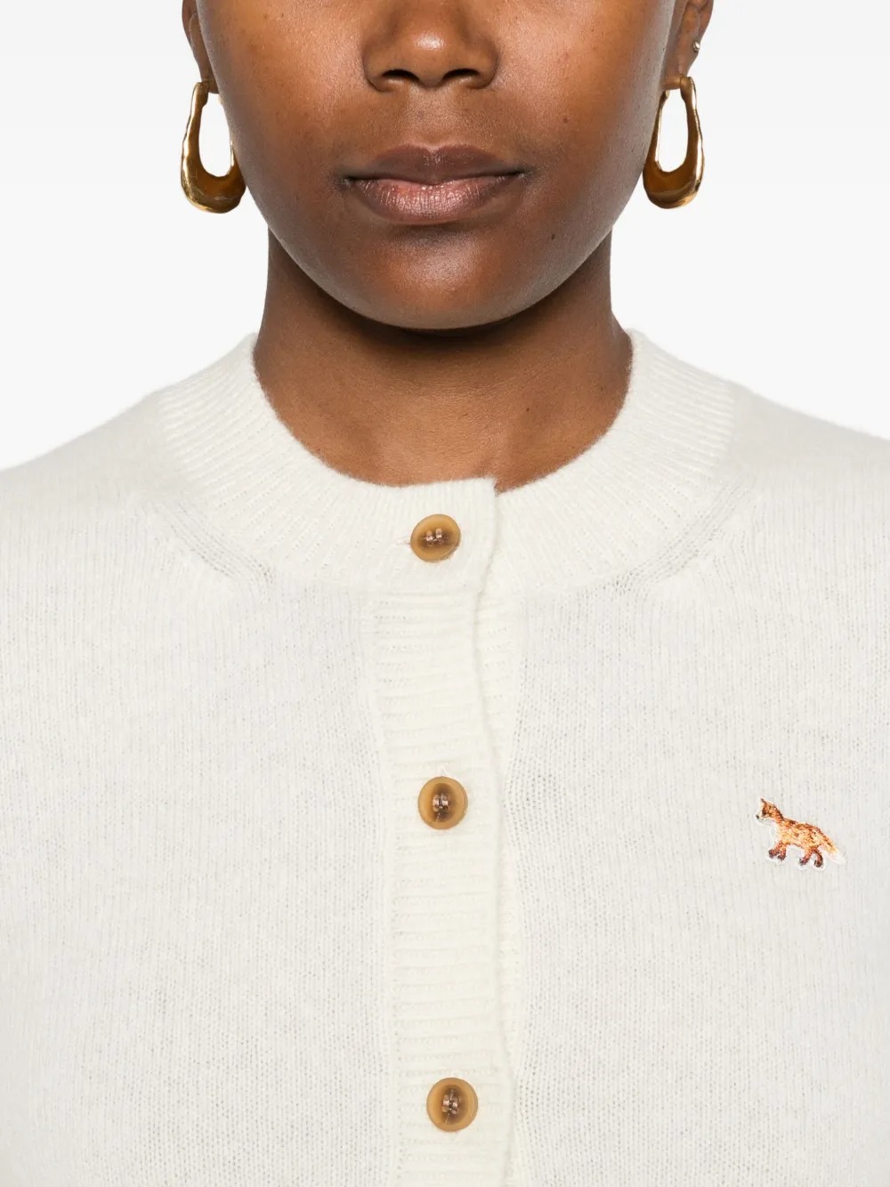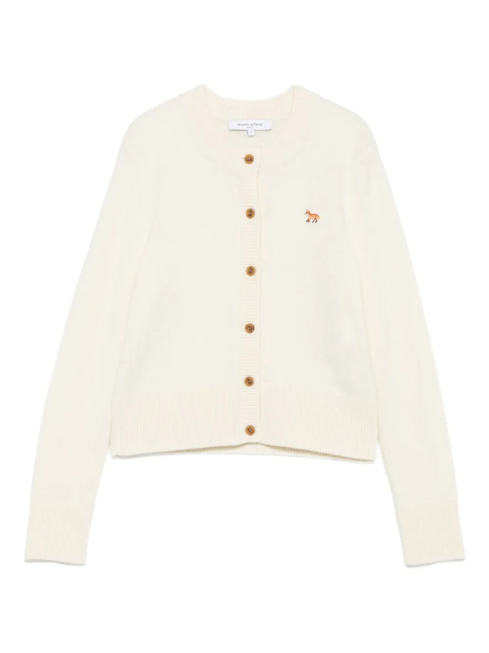Cardigan ecru di Maison Kitsuné in lana con ricamo volpe, bottoni frontali, maniche lunghe e orlo a coste.