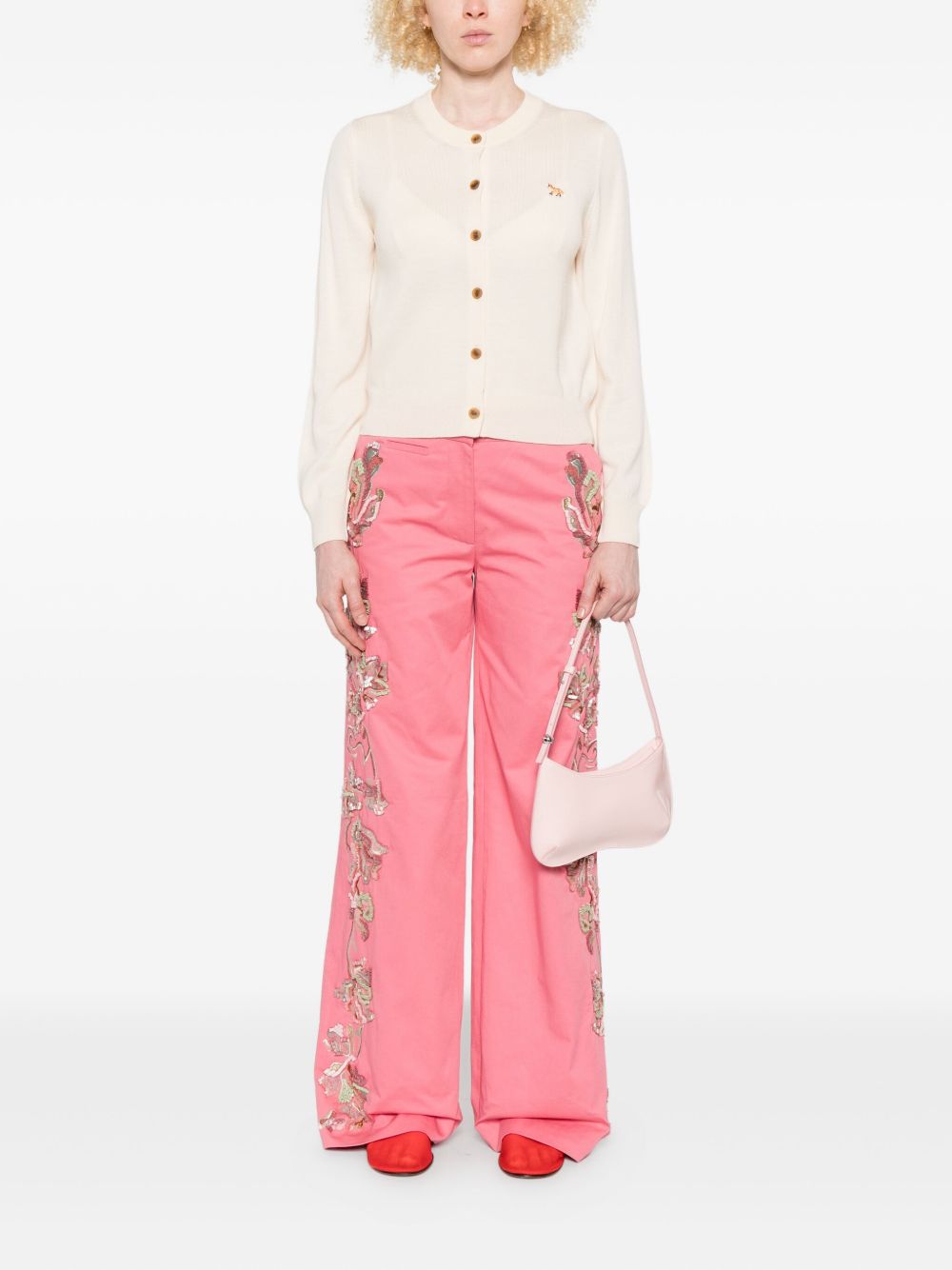 Cardigan rosa perla di Maison Kitsuné in lana con ricamo volpe, bottoni frontali, maniche lunghe e orlo a coste.