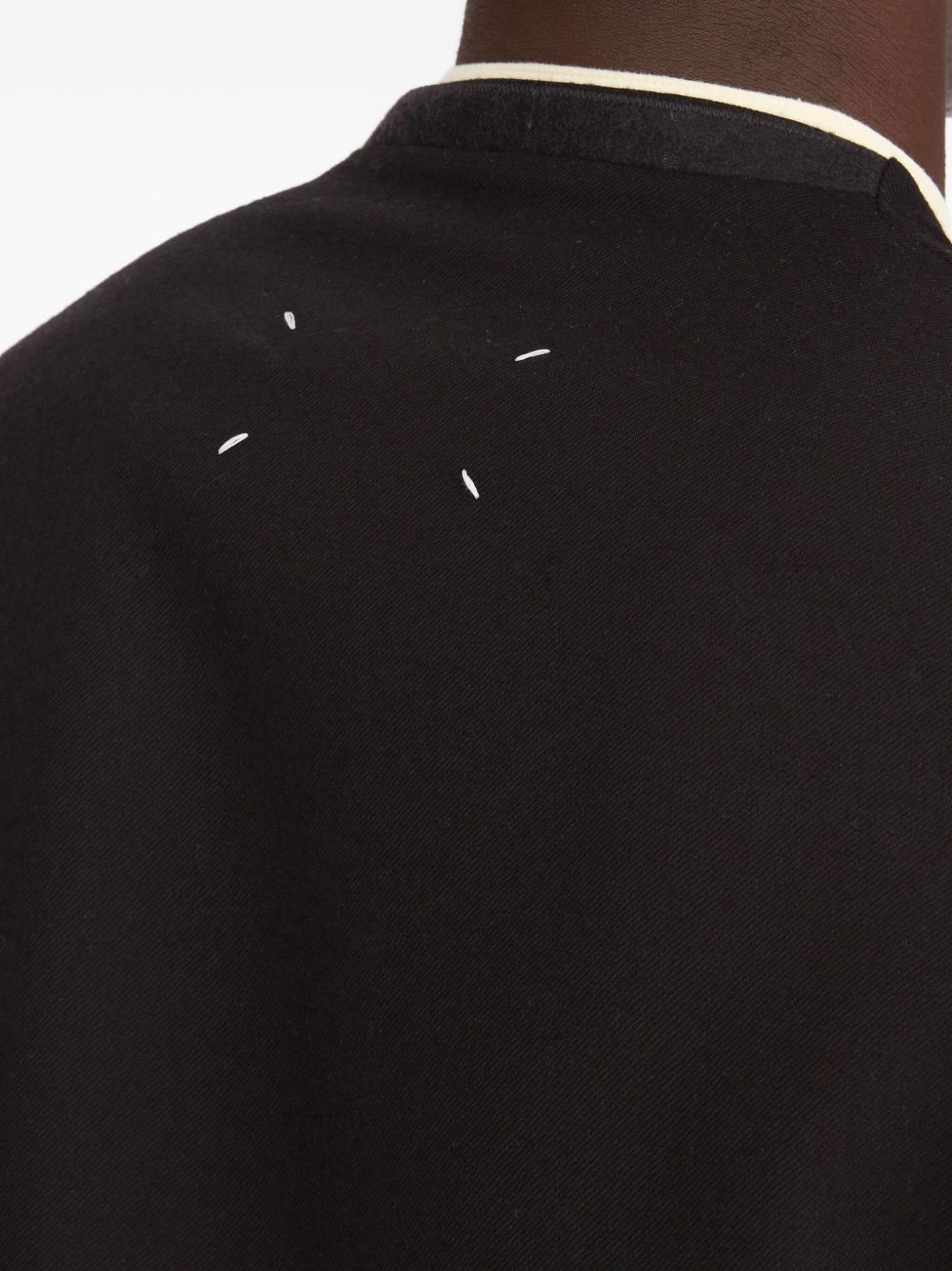 Giacca nera Minimal di Maison Margiela in lana senza colletto, maniche lunghe, cuciture bianche sul retro e orlo dritto.