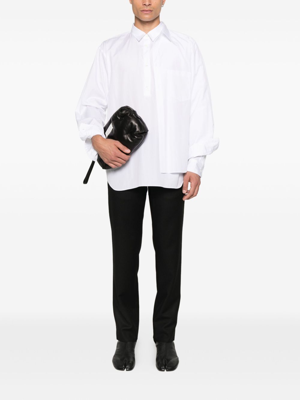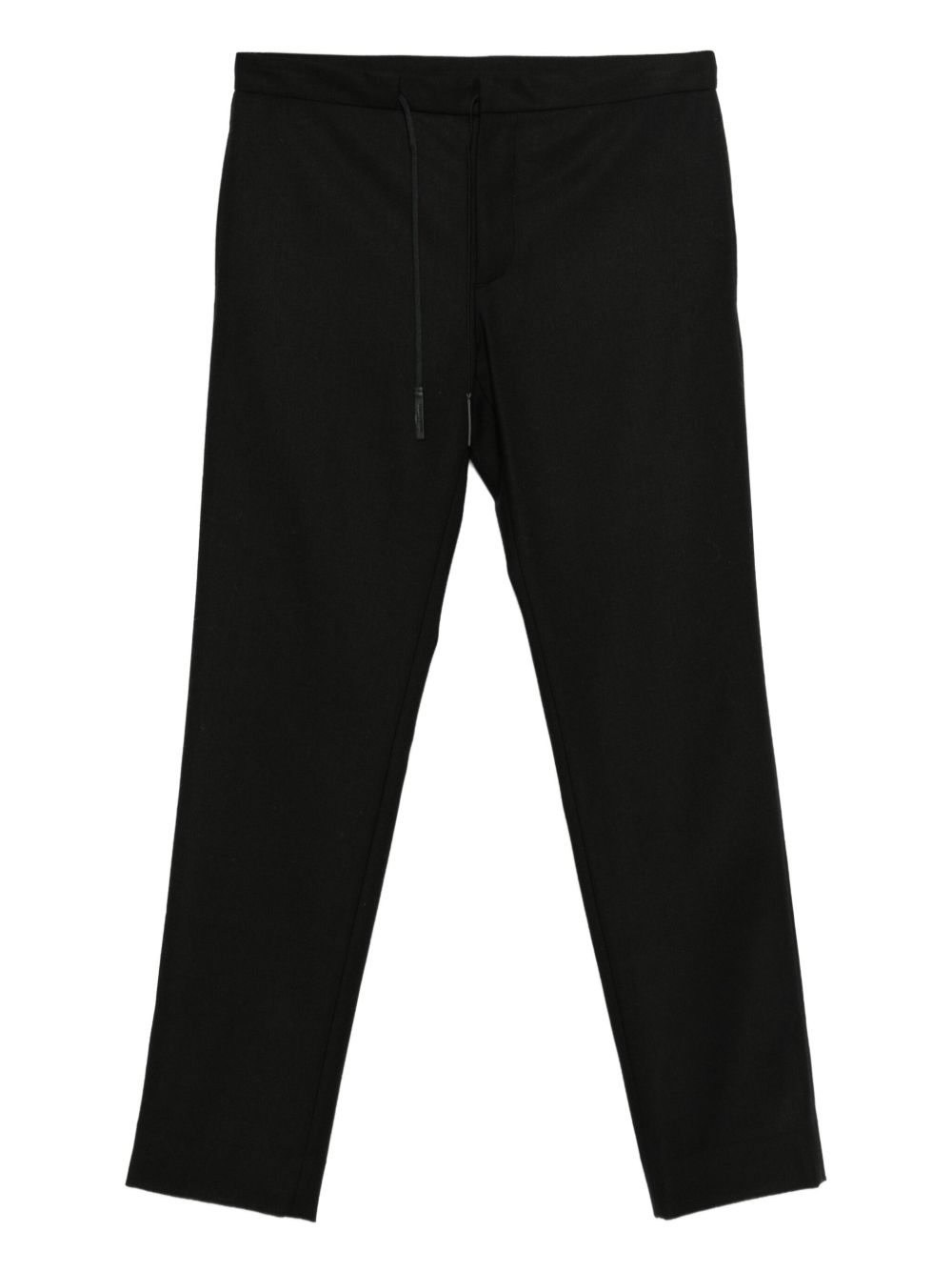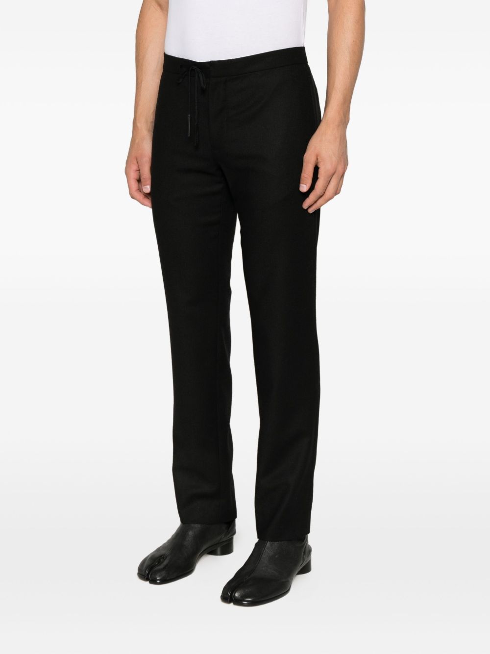 Pantaloni neri di Maison Margiela in lana con chiusura a cordoncino, patta con zip, tasche laterali, tasche posteriori, cuciture bianche sul retro e vestibilità gamba dritta.