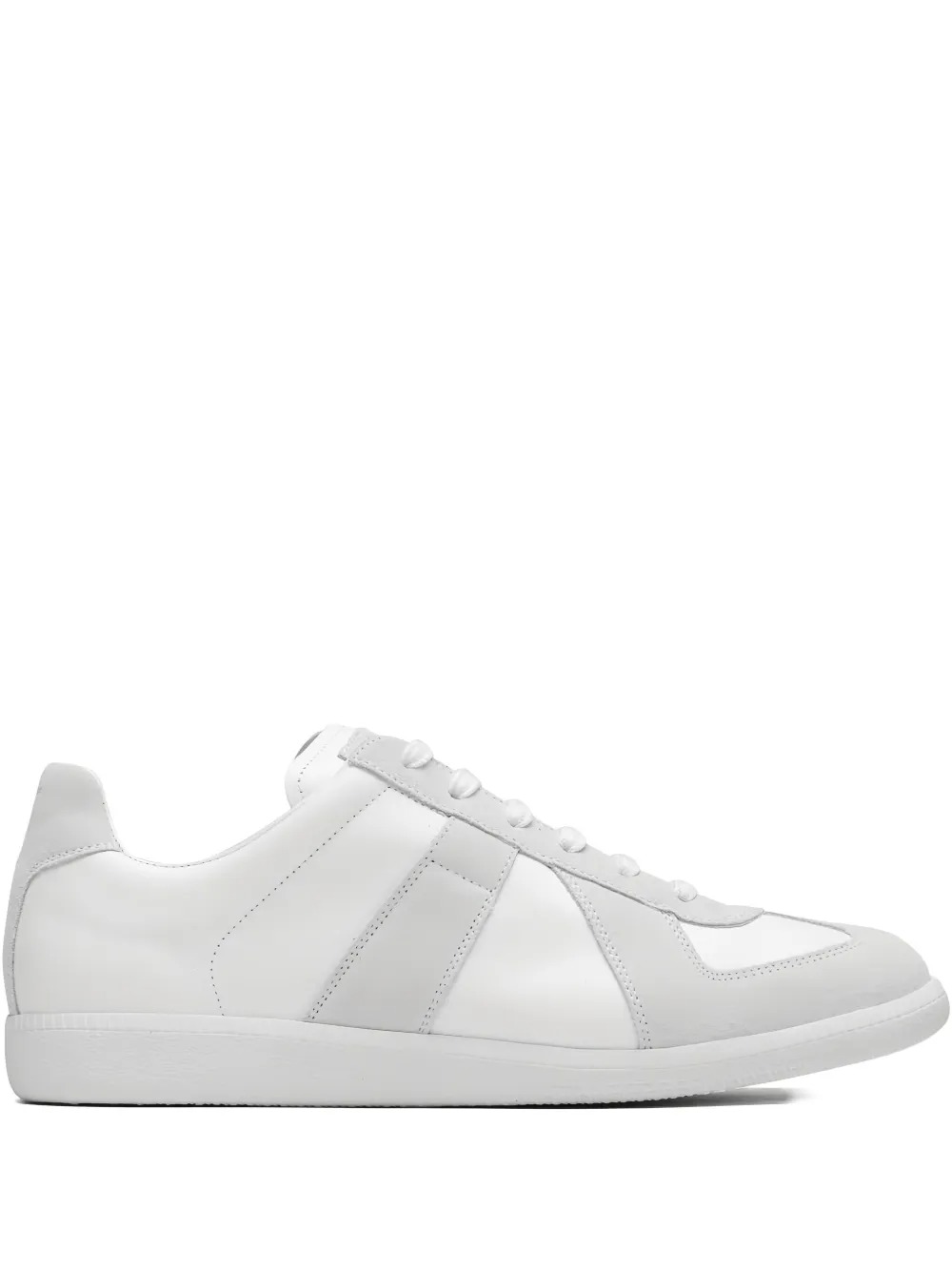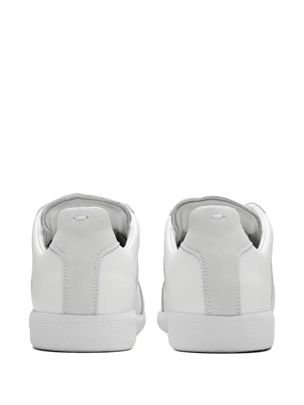Sneakers bianche Replica di Maison Margiela in pelle con punta tonda, chiusura frontale con lacci, suola in gomma e logo sulla linguetta.