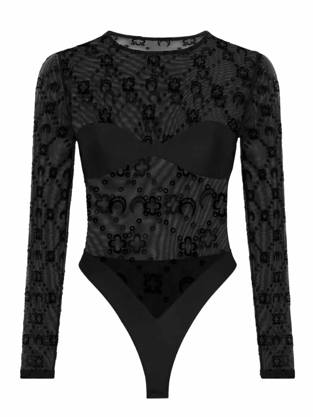 Body nero di Marine Serre in poliammide con finitura con effetto vellutato, maniche lunghe, girocollo e motivo con monogramma.