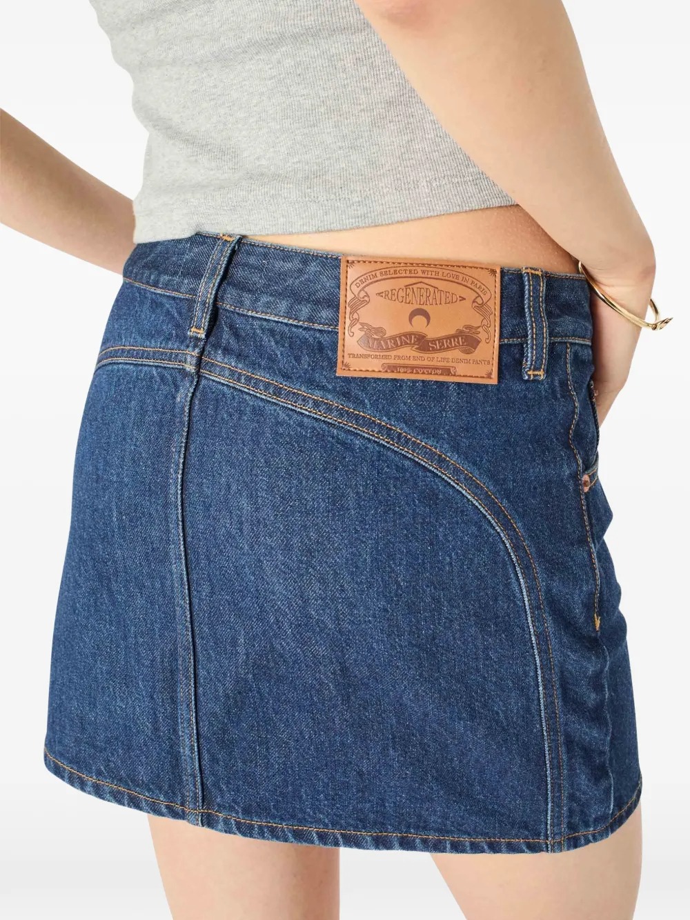 Gonna blu di Marine Serre in cotone con hiusura con cerniera, passanti per cintura, modello a cinque tasche, toppa con logo sul retro, impunture a contrasto.