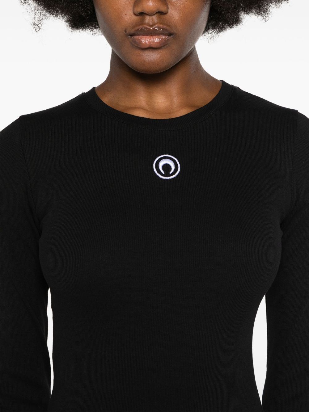 Mini abito nero di Marine Serre in cotone con scollo rotondo, maniche lunghe e applicazione con logo.