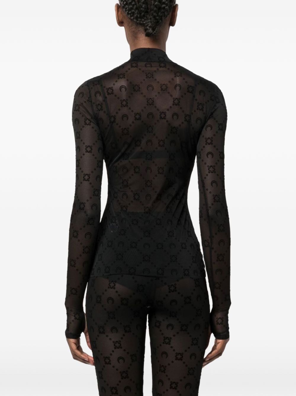 Top nero di Marine Serre in poliammide con collo alto, maniche lunghe, stampa all-over e orlo dritto