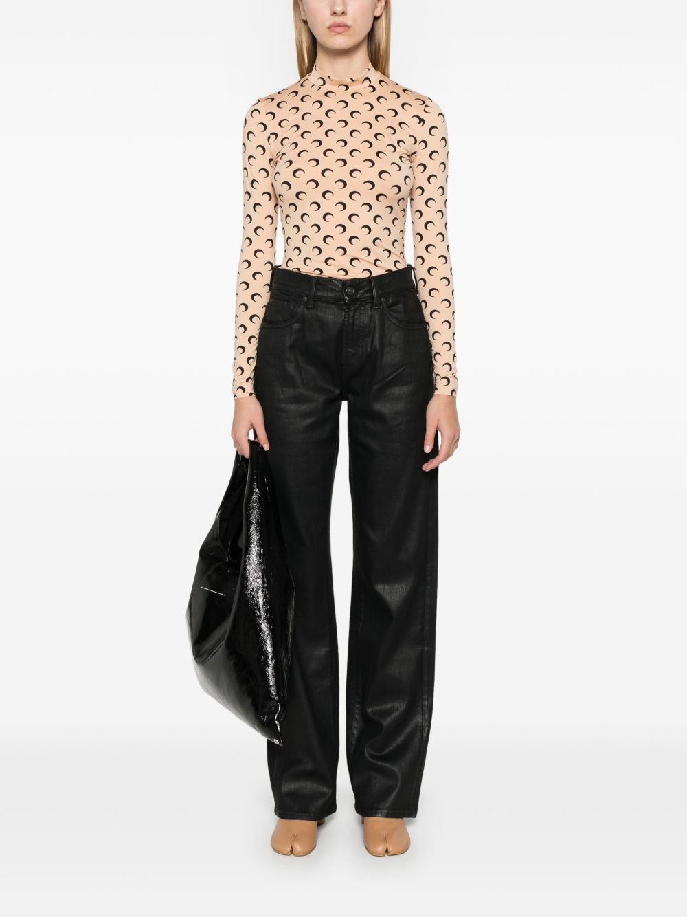 Top beige Moon Printed Jersey di Marine Serre in poliammide con collo alto, maniche lunghe, stampa all-over e orlo dritto.