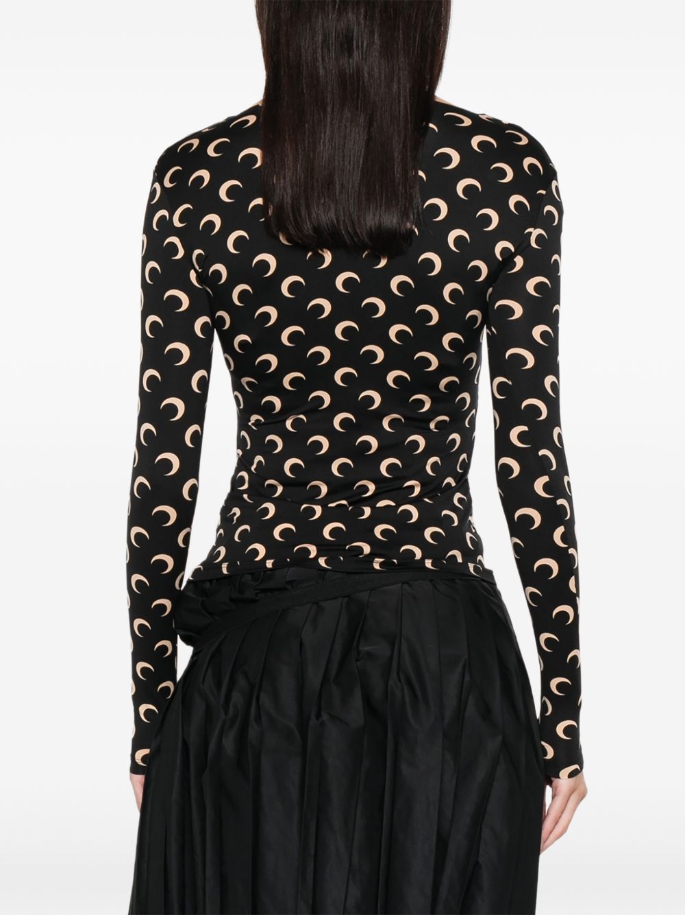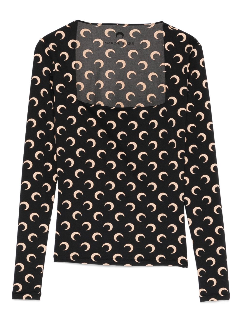 Top nero di Marine Serre in poliammide con stampa Moon, scollo quadrato e maniche lunghe.