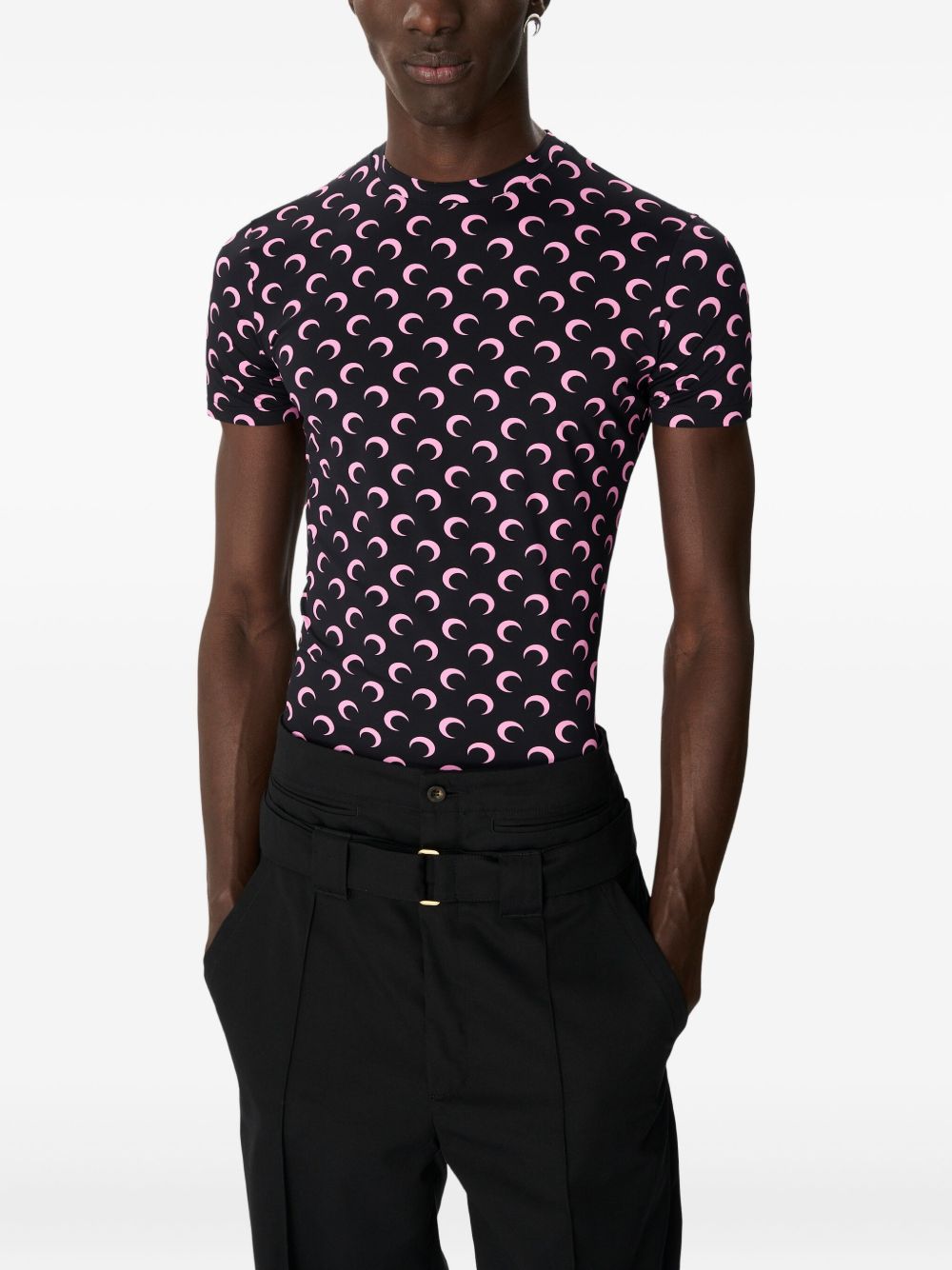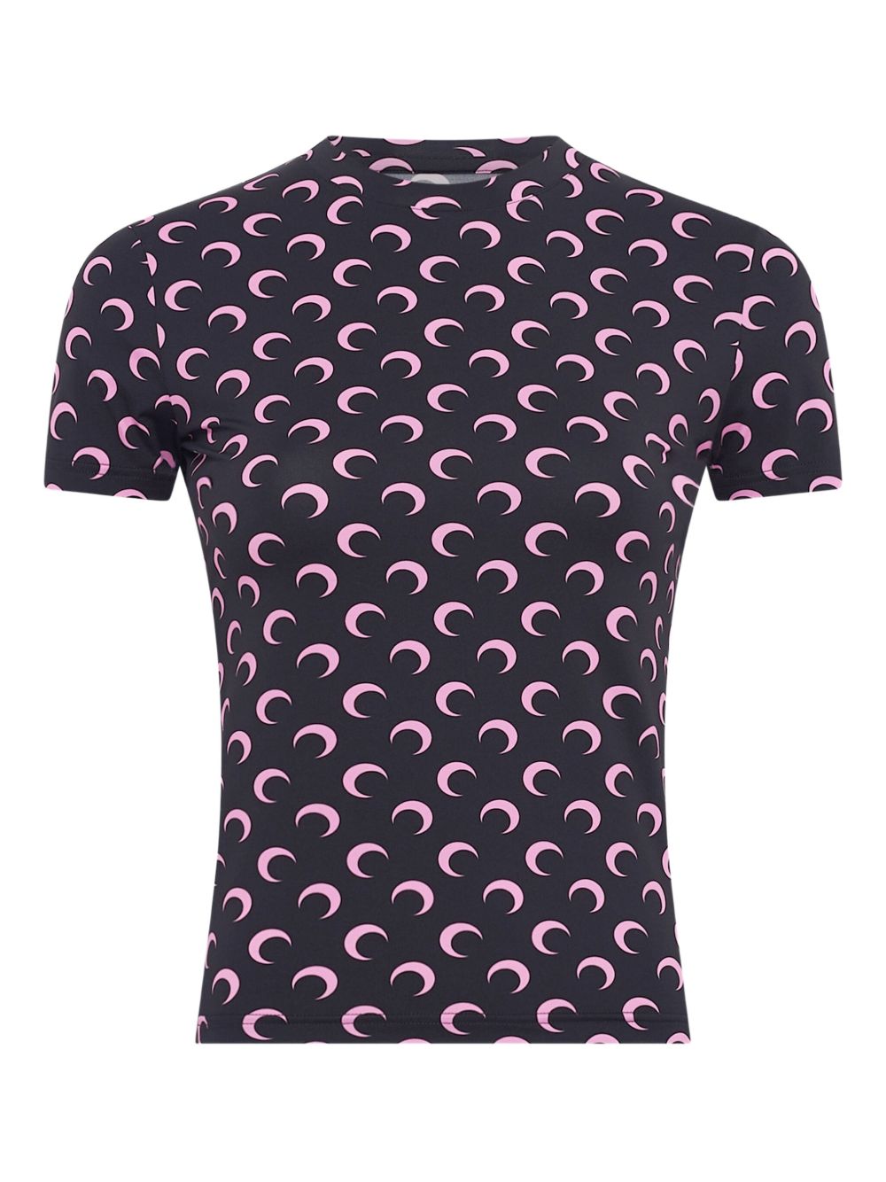Top nero e rosa di Marine Serre in poliammide con girocollo, maniche corte, stampa all-over e orlo dritto.