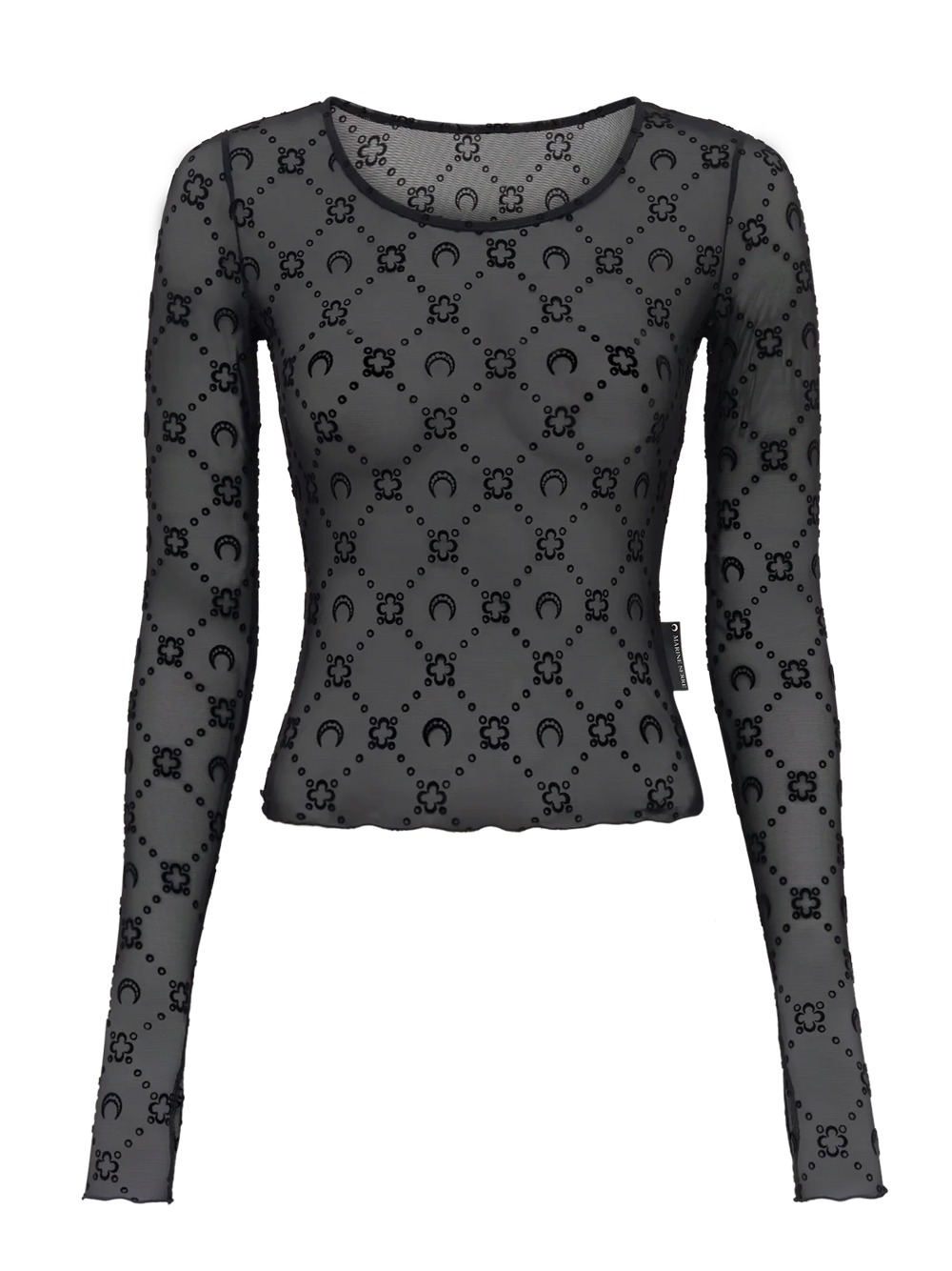 Top nero di Marine Serre in poliammide con girocollo, maniche lunghe, stampa all-over e orlo increspato.