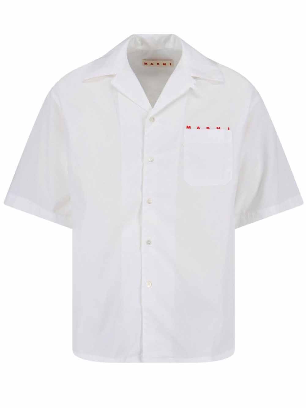 Camicia bianca di Marni in cotone con colletto posteriore, taschino sul petto, chiusura a bottoni, maniche corte e logo rosso.
