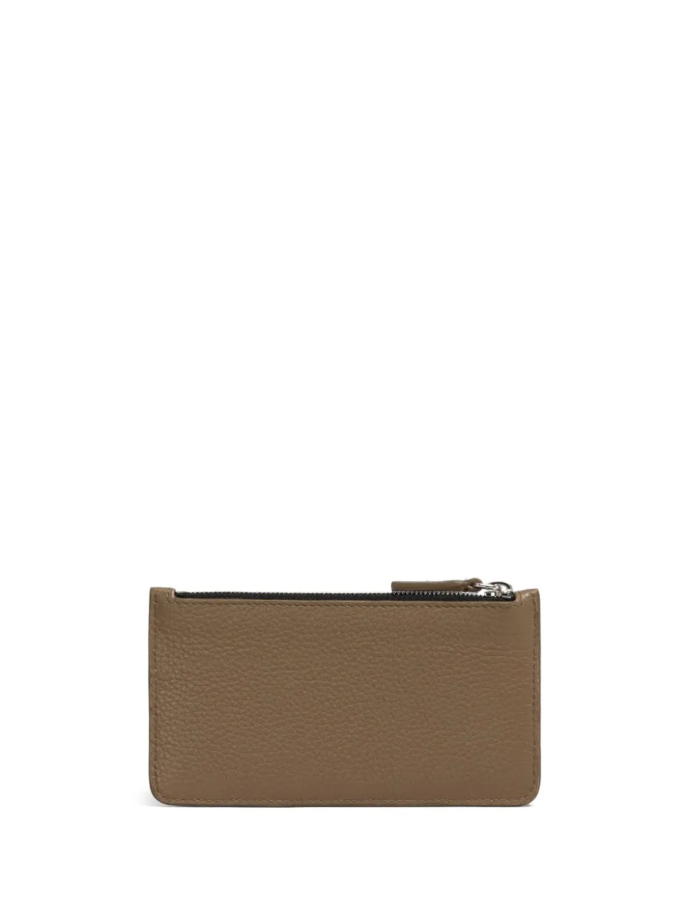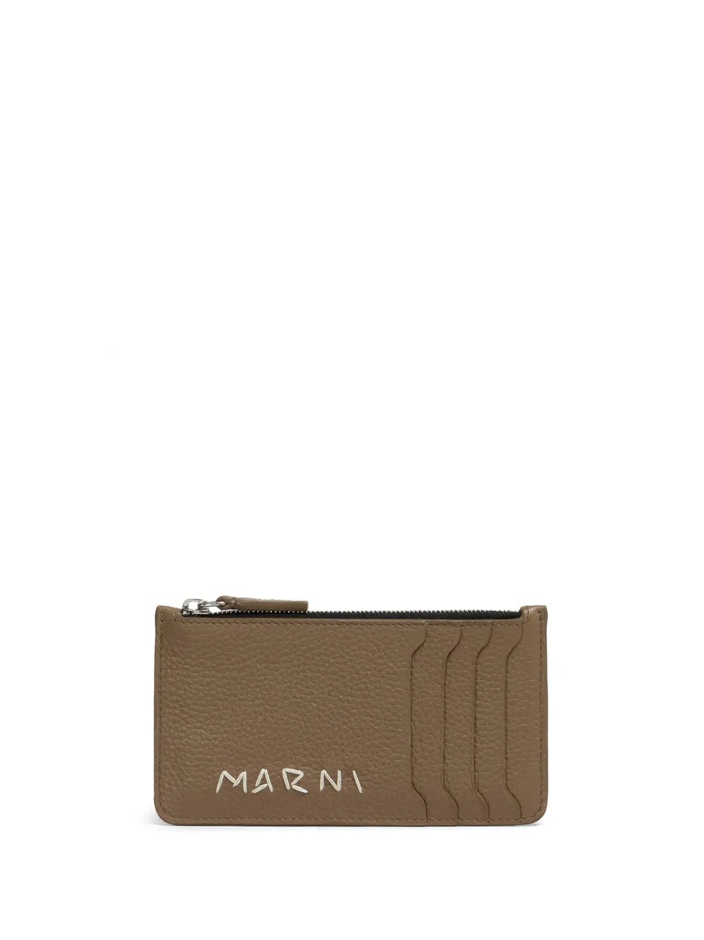 Prtacarte marrone di Marni in pelle con trama martellata, design rettangolare, ricamo con logo frontale, fessure portacarte interne e scomparto laterale con zip.