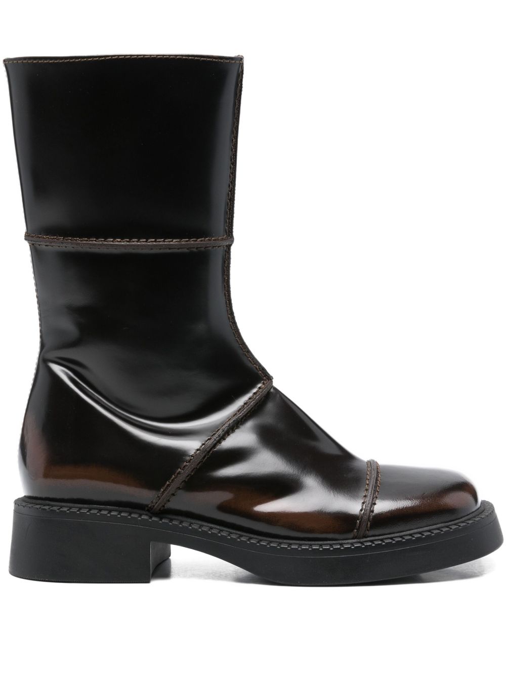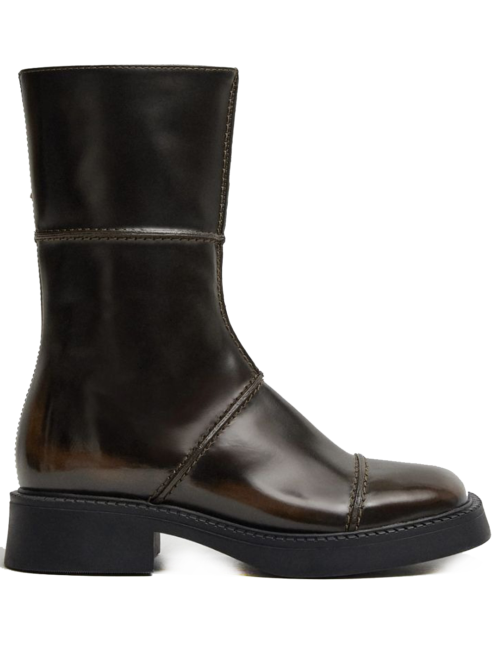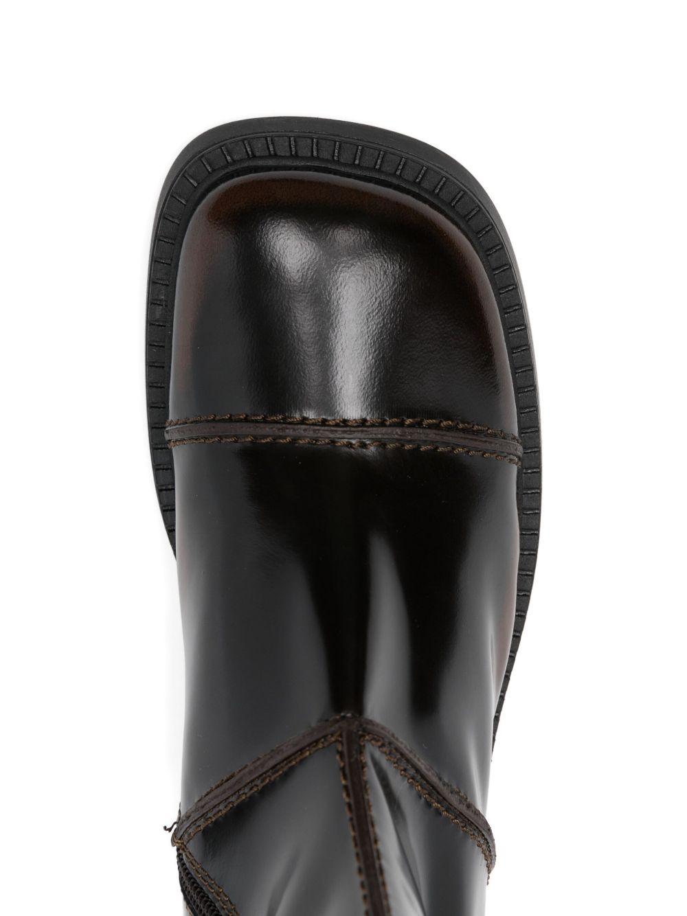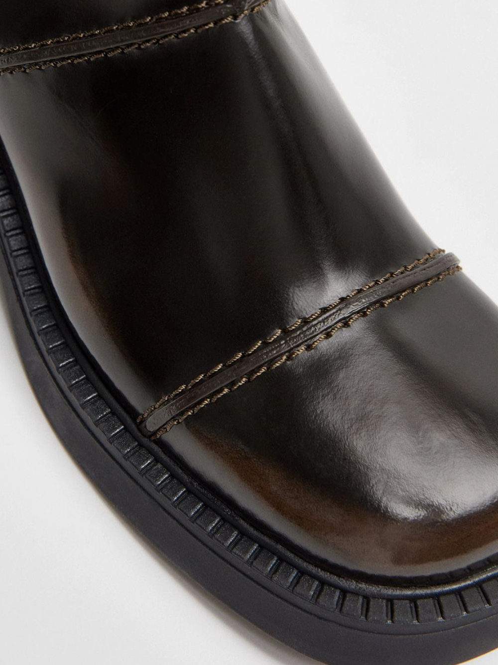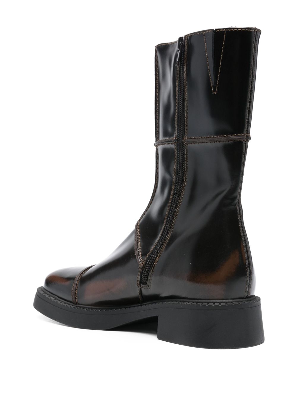 Stivali marrone scuro Dhalia di Miista in pelle con chiusura laterale con zip, dettaglio con cuciture, punta quadrata, tacco largo e suola esterna in gomma.
