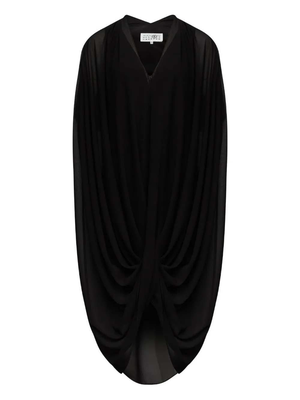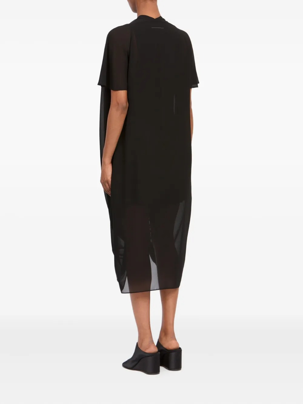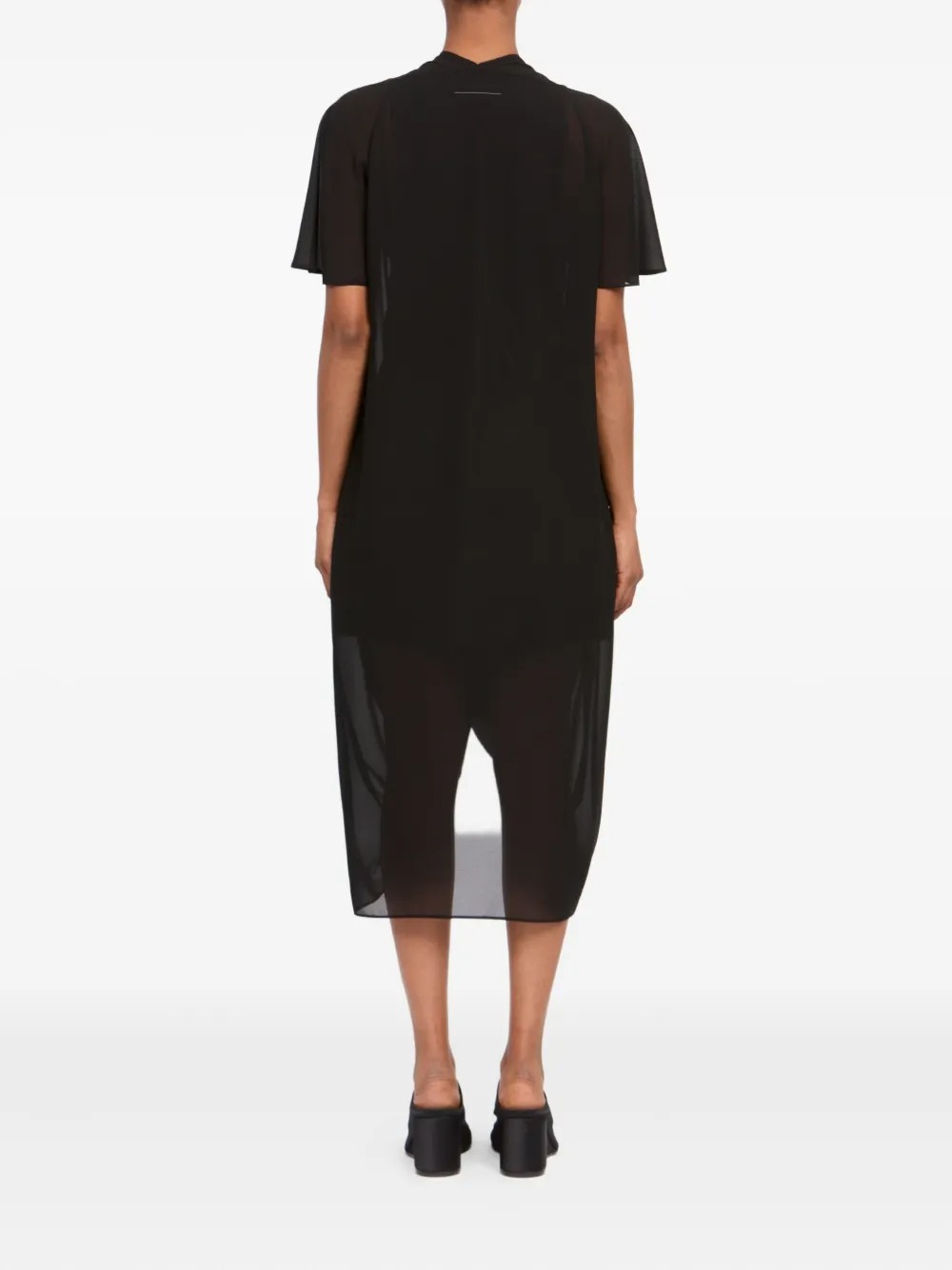 Maxi abito nero di MM6 Maison Margiela in poliestere con scollo a V, maniche corte, dettaglio drappeggiato, orlo asimmetrico e finitura semi trasparente.