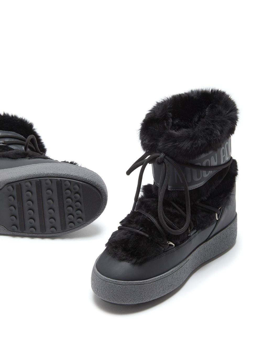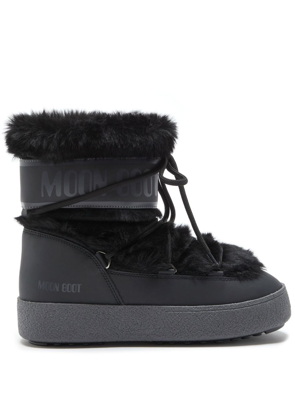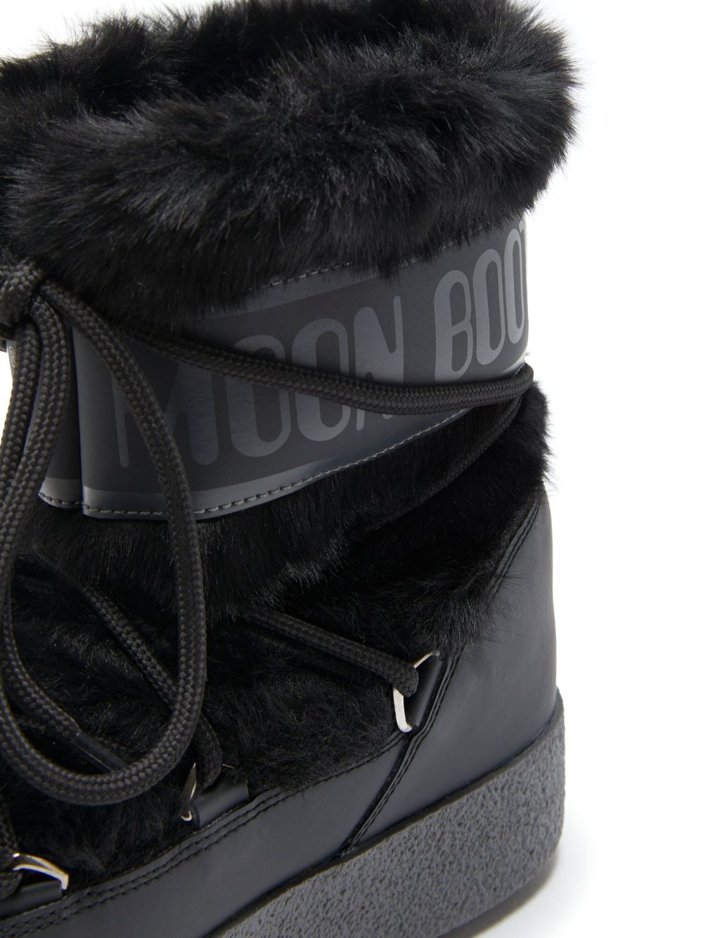 Stivali neri da donna Itrack Faux Fur Wp di Moon Boot con punta tonda, chiusura superiore con coulisse, design slip-on e imbottito, dettaglio con logo e suola piatta.