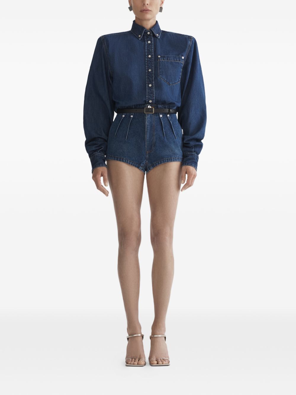 Pantaloncini blu Denim Tailored di Mugler in cotone con vita alta, pieghe e passanti.