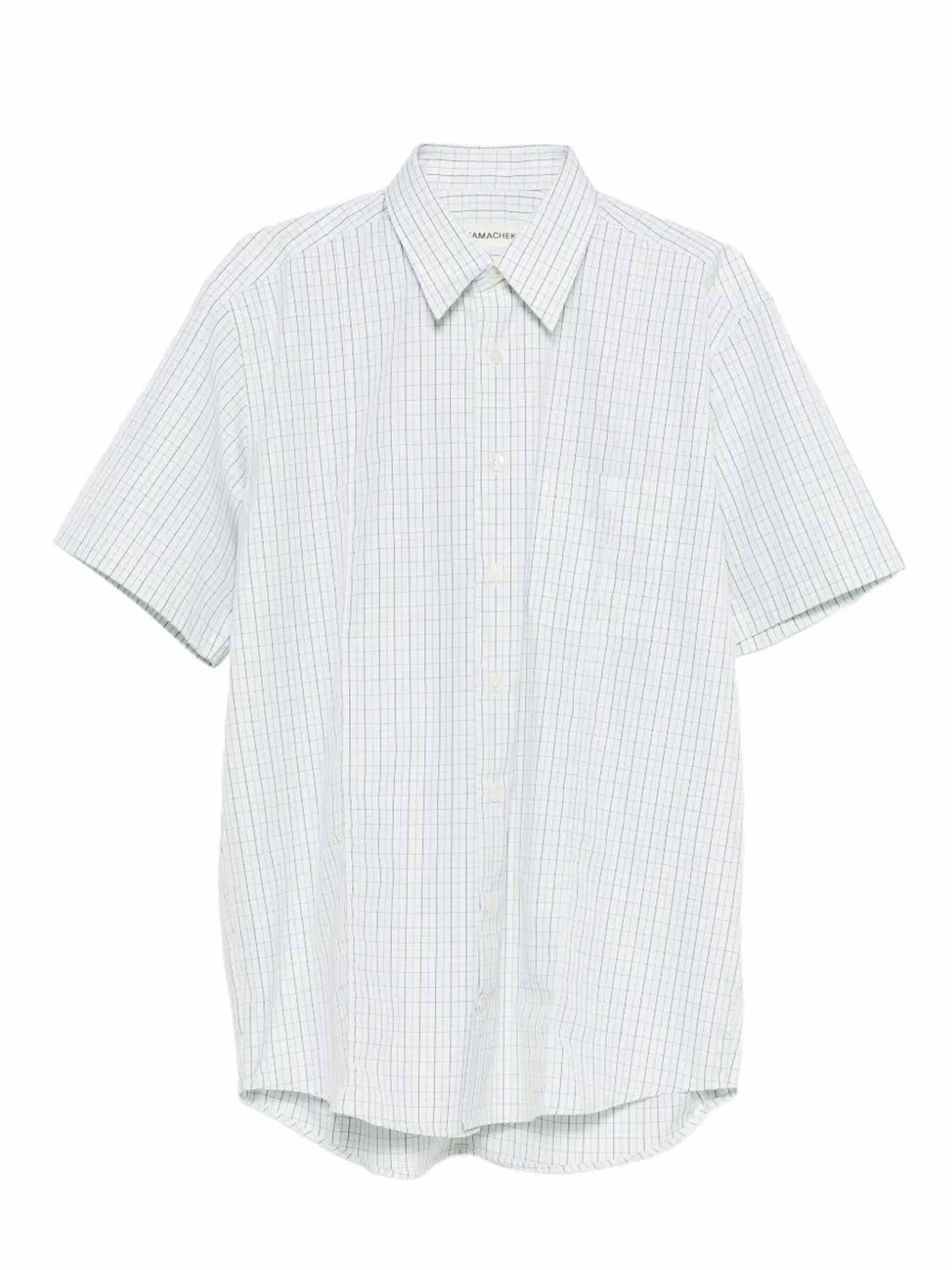 Camicia menta a quadri Cordelia di Namacheko in cotone con colletto classico, chiusura frontale con bottoni, taschino sul petto, manica corta e orlo curvo.