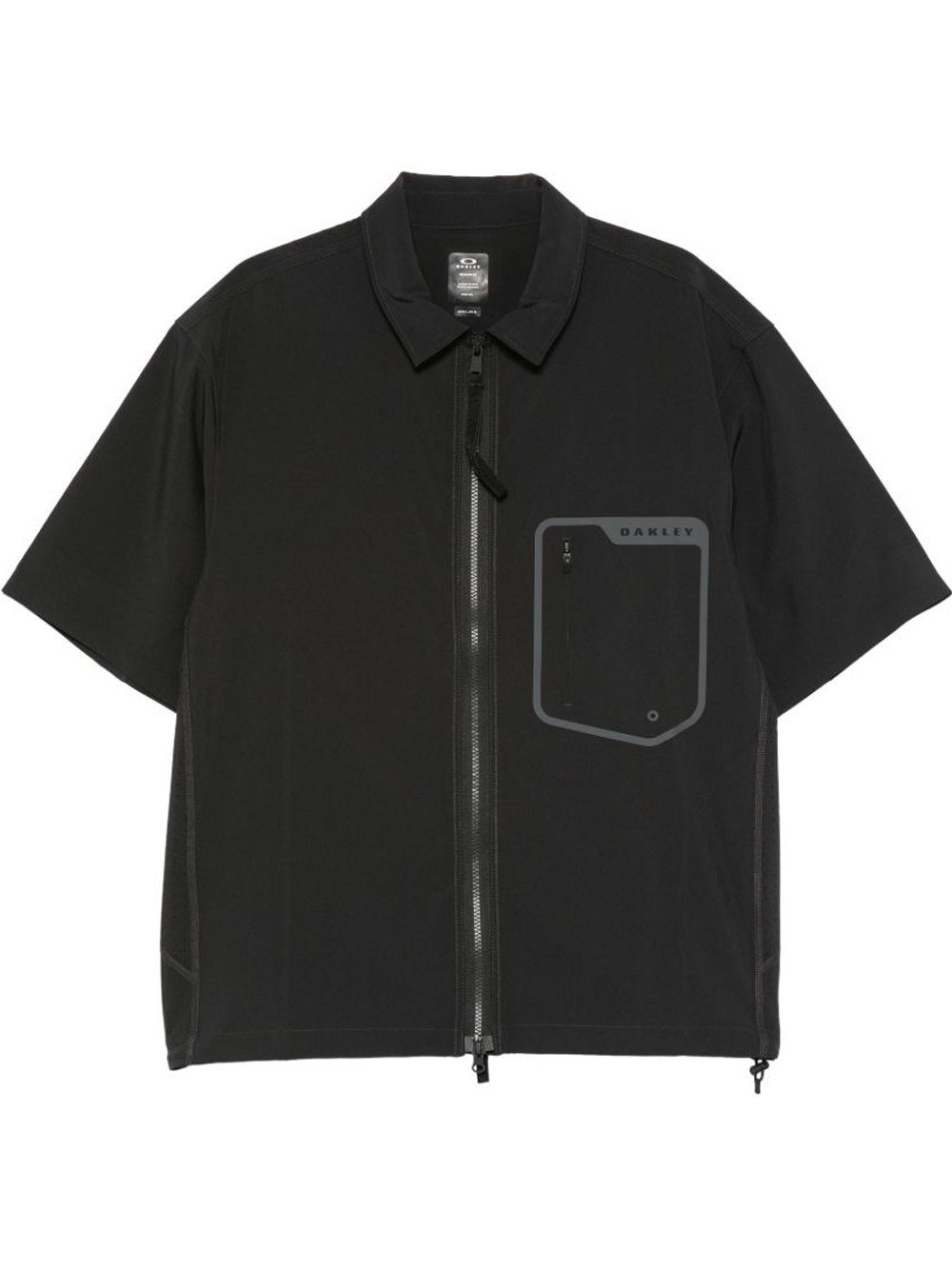 Camicia nera di oakley in poliestere con colletto clazzico, chiusura frontale con zip tasca termosaldata con zip e orlo con coulisse.