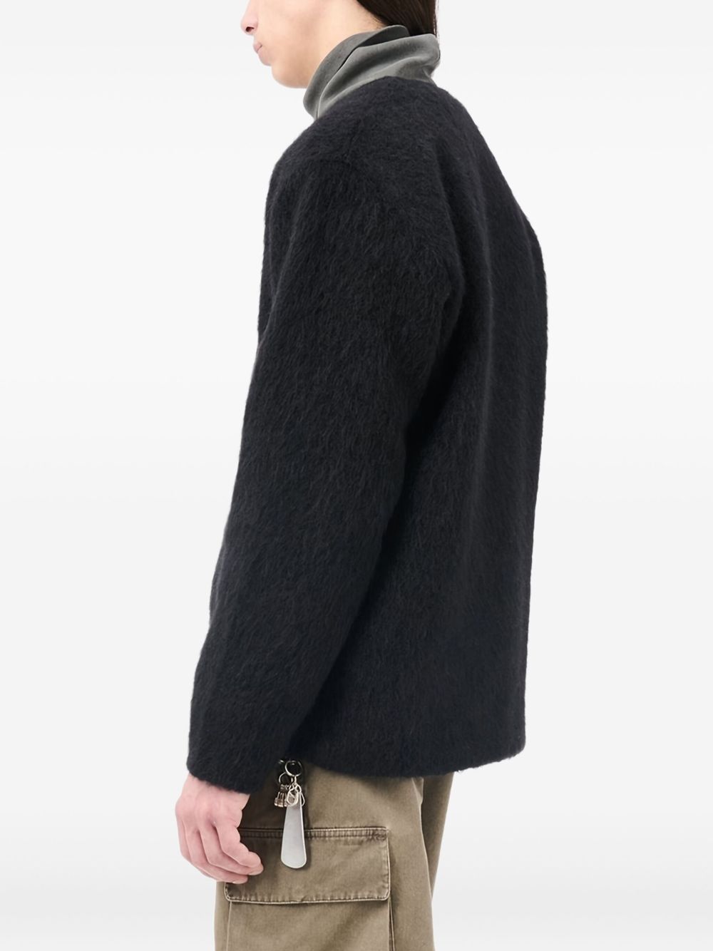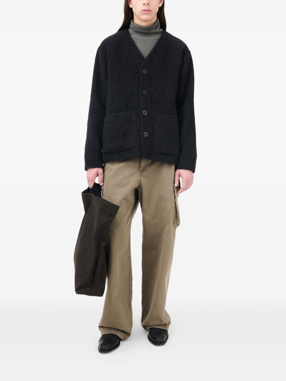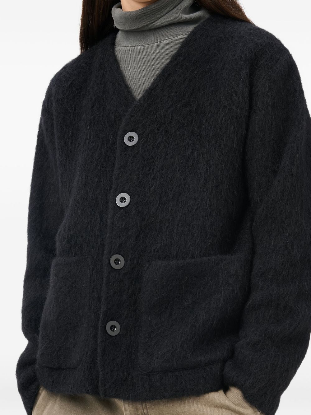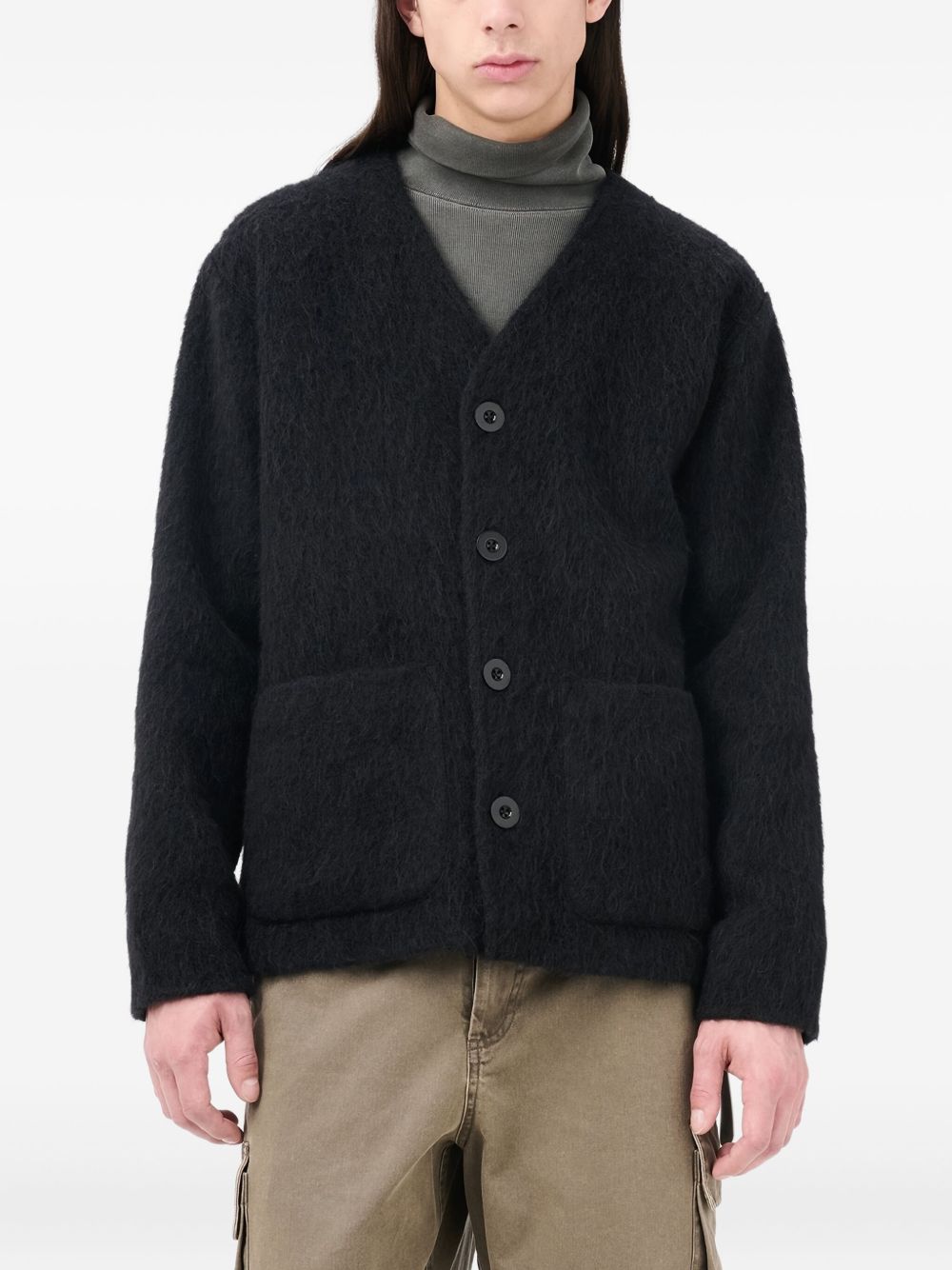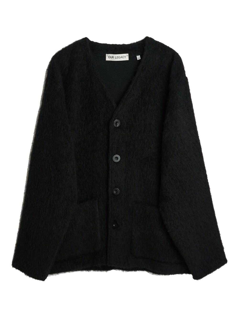 Cardigan nero di Our Legacy in mohair con scollo a V, chiusura frontale con bottoni, tasche laterali e orlo dritto.